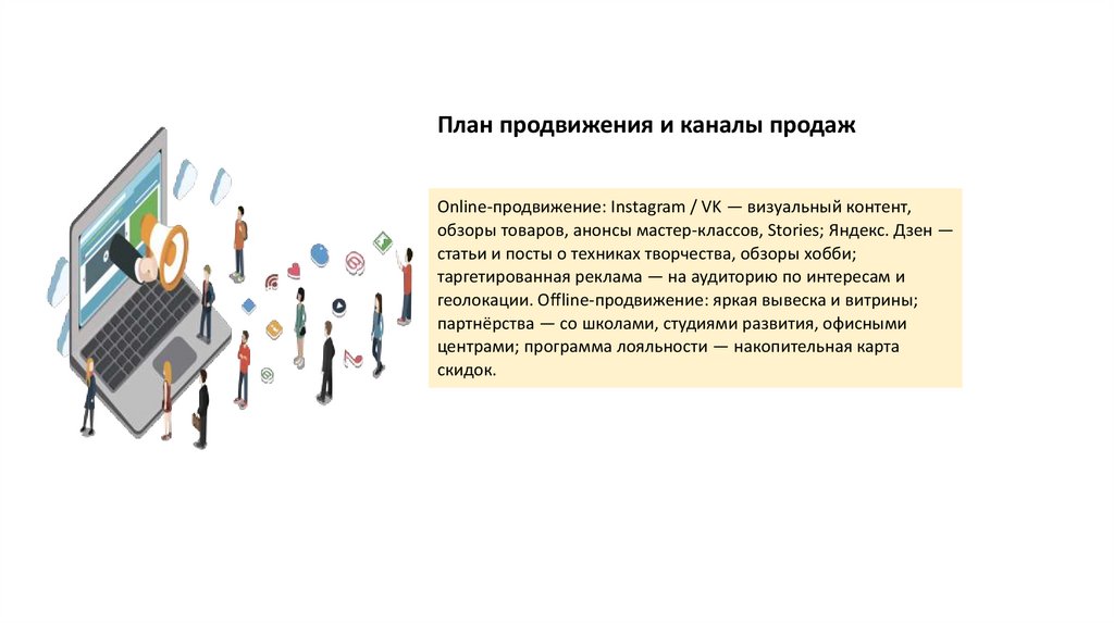 План продвижения и каналы продажOnline-продвижение: Instagram / VK — визуальный контент,