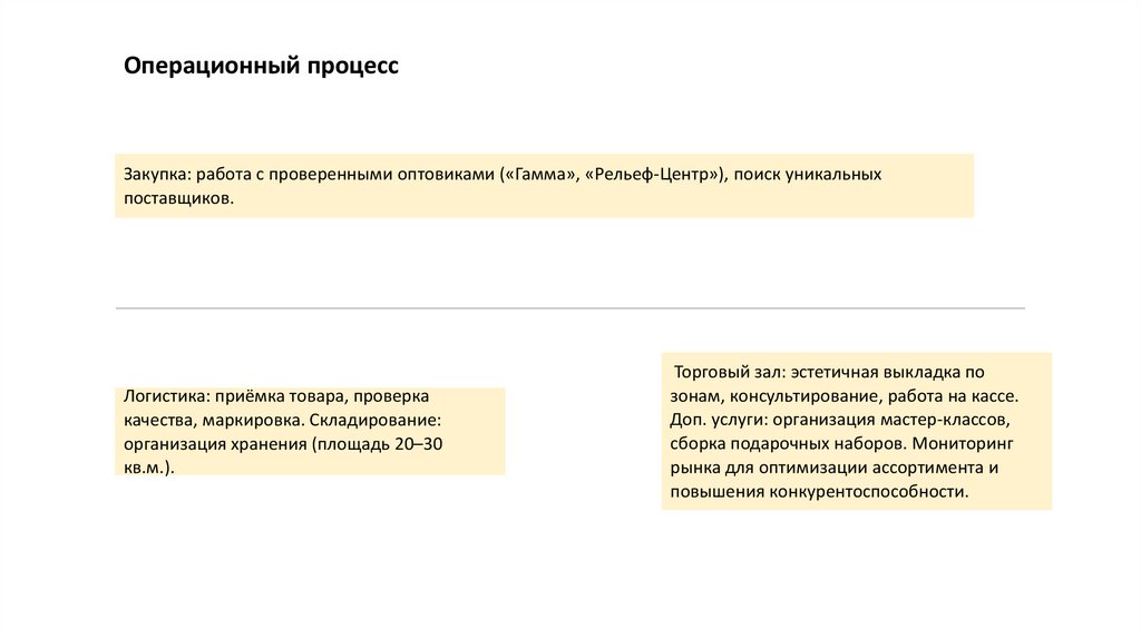 Операционный процессЗакупка: работа с проверенными оптовиками («Гамма», «Рельеф-Центр»), поиск уникальных