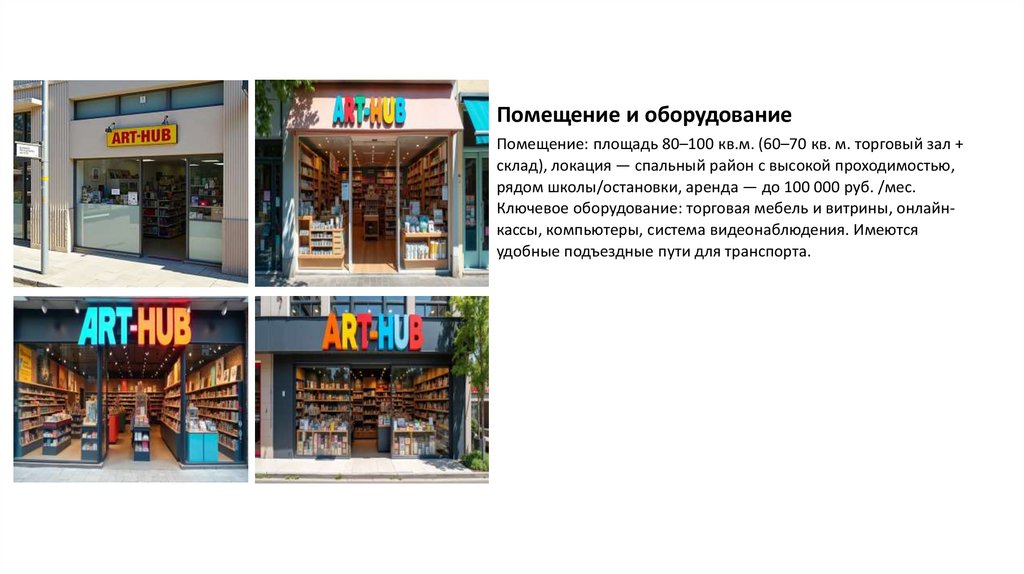 Помещение и оборудованиеПомещение: площадь 80–100 кв.м. (60–70 кв. м. торговый зал +