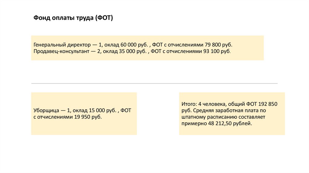 Фонд оплаты труда (ФОТ)Генеральный директор — 1, оклад 60 000 руб. , ФОТ с отчислениями 79 800 руб.