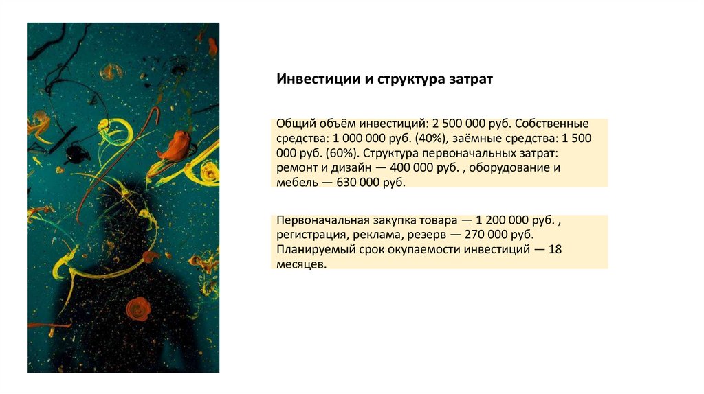 Инвестиции и структура затратОбщий объём инвестиций: 2 500 000 руб. Собственные
