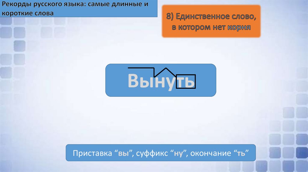 ВынутьПриставка “вы”, суффикс “ну”, окончание “ть”