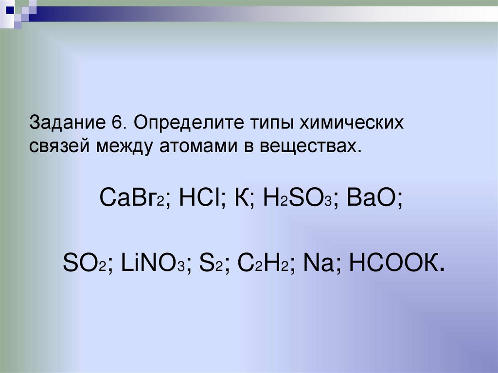 Задание 6. Определите типы химическихсвязей между атомами в веществах.