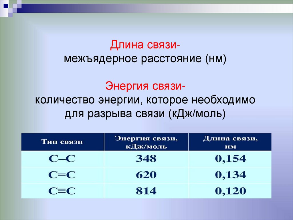 Длина связимежъядерное расстояние (нм)Энергия связиколичество энергии, которое необходимо