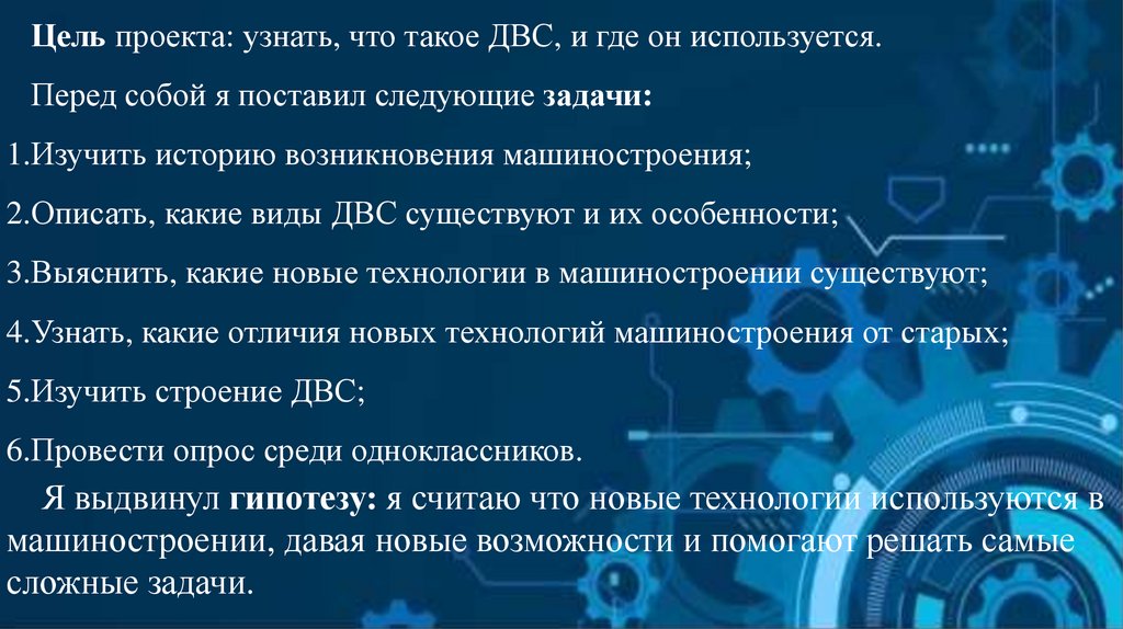 Цель проекта: узнать, что такое ДВС, и где он используется.Перед собой я поставил следующие задачи: