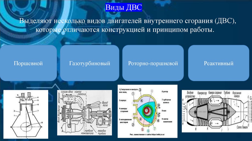 Виды ДВС.Выделяют несколько видов двигателей внутреннего сгорания (ДВС),