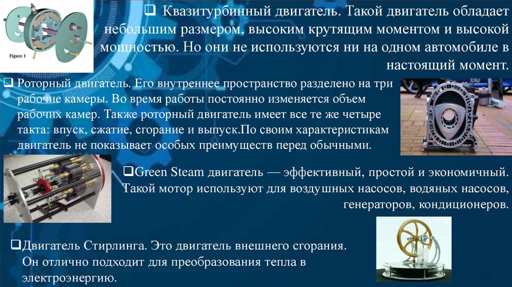 Квазитурбинный двигатель. Такой двигатель обладаетнебольшим размером, высоким крутящим моментом и высокой