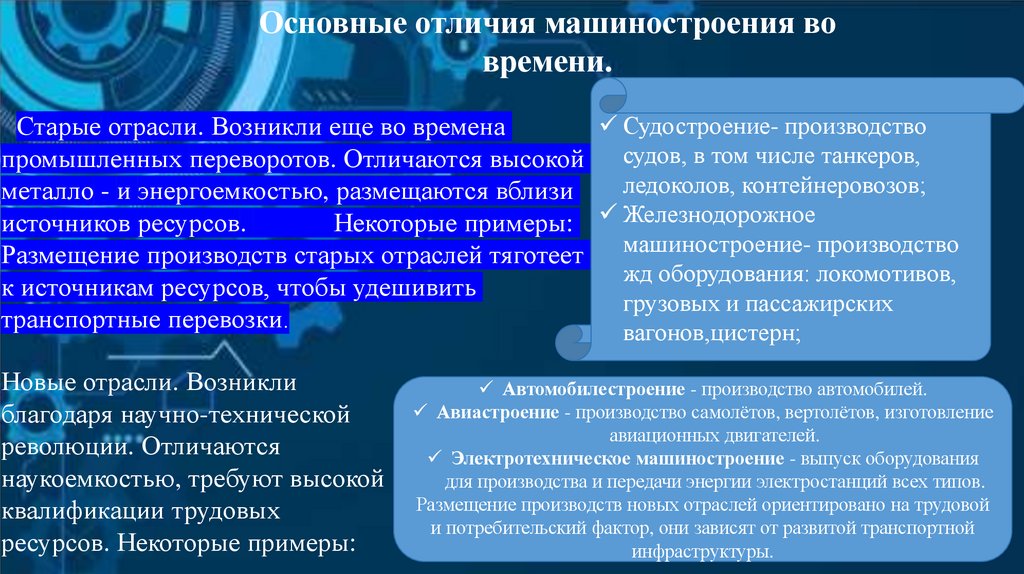 Размещение производств старых отраслей тяготеет машиностроение- производство