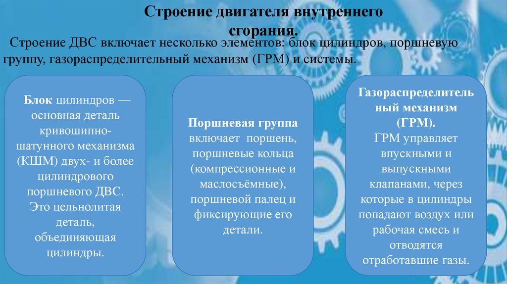 Строение ДВС включает несколько элементов: блок цилиндров, поршневую