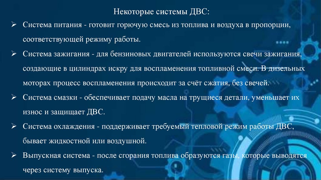Некоторые системы ДВС:Система питания - готовит горючую смесь из топлива и воздуха в пропорции,