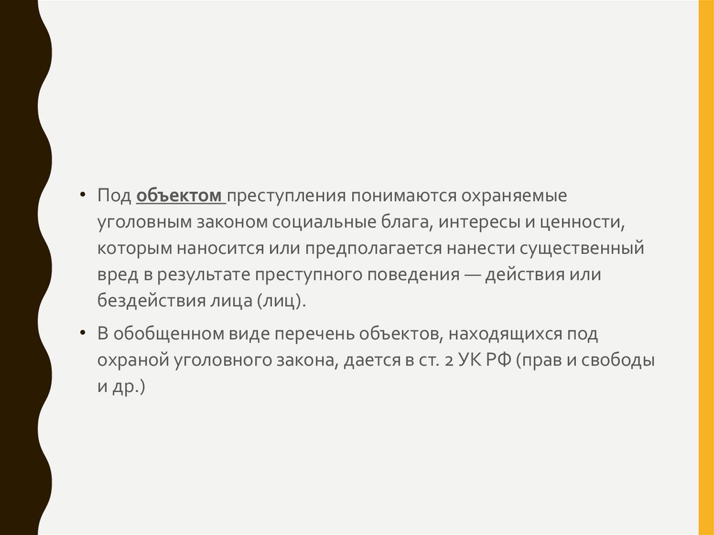 • Под объектом преступления понимаются охраняемыеуголовным законом социальные блага, интересы и ценности,