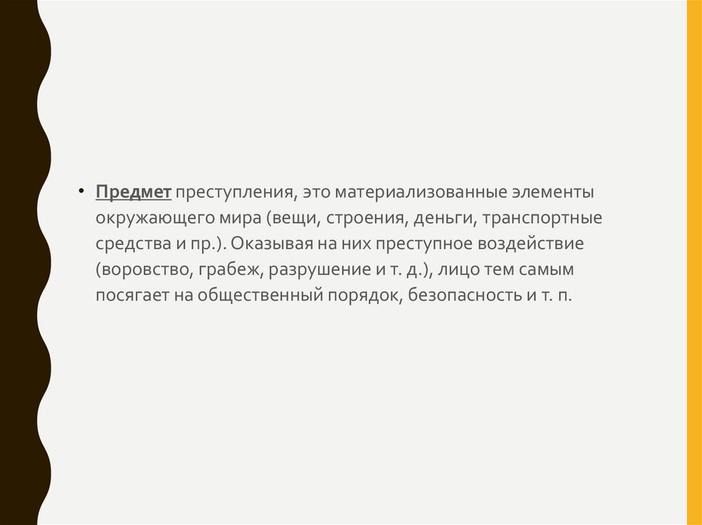 • Предмет преступления, это материализованные элементыокружающего мира (вещи, строения, деньги, транспортные