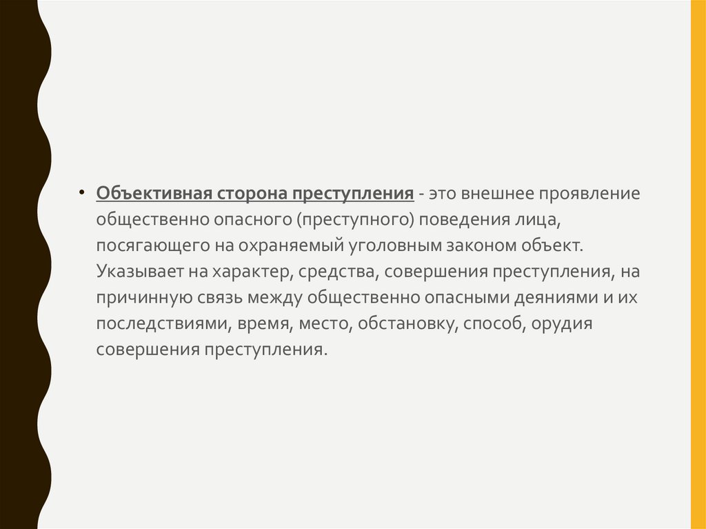 • Объективная сторона преступления - это внешнее проявлениеобщественно опасного (преступного) поведения лица,