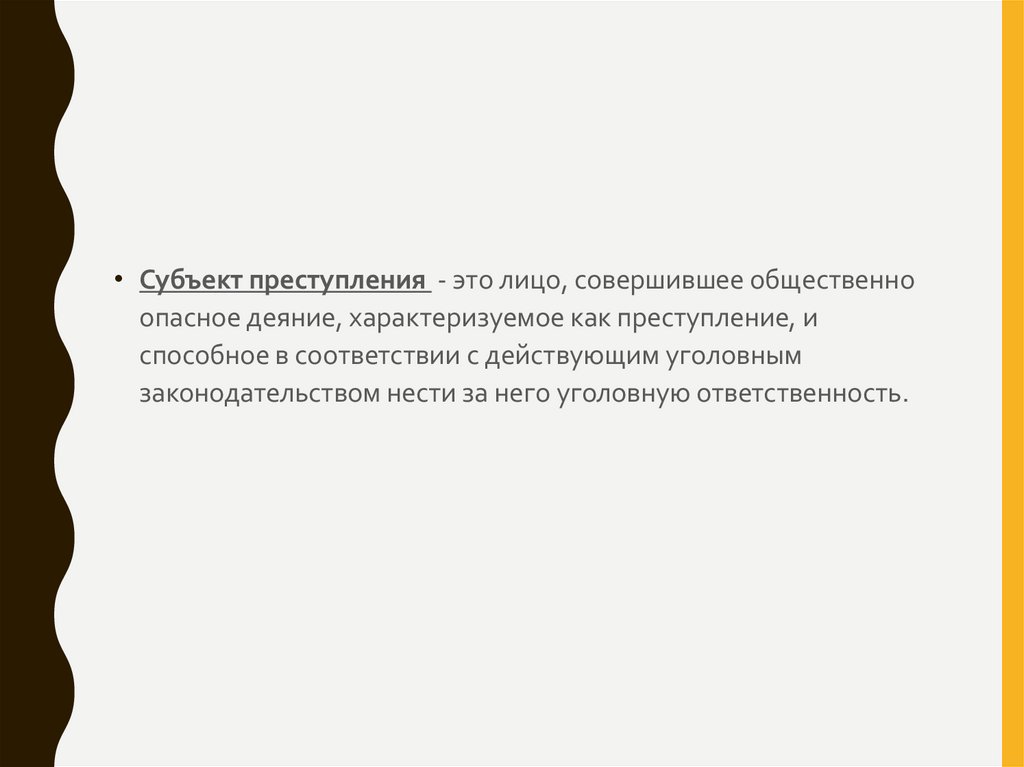 • Субъект преступления - это лицо, совершившее общественноопасное деяние, характеризуемое как преступление, и