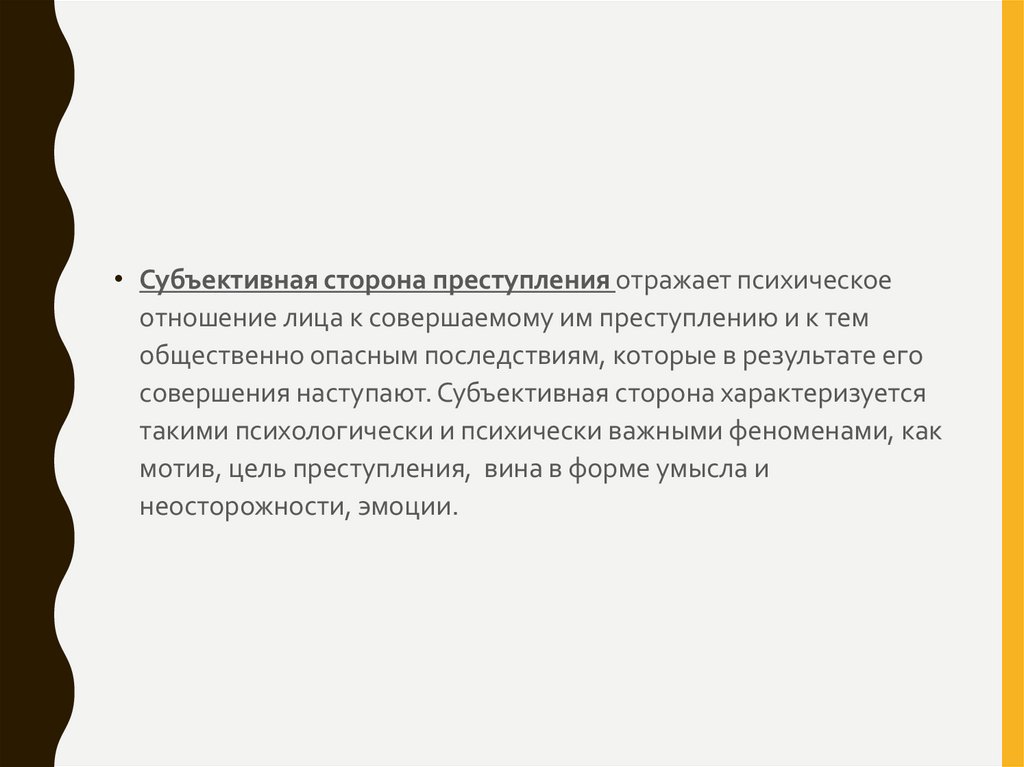 • Субъективная сторона преступления отражает психическоеотношение лица к совершаемому им преступлению и к тем