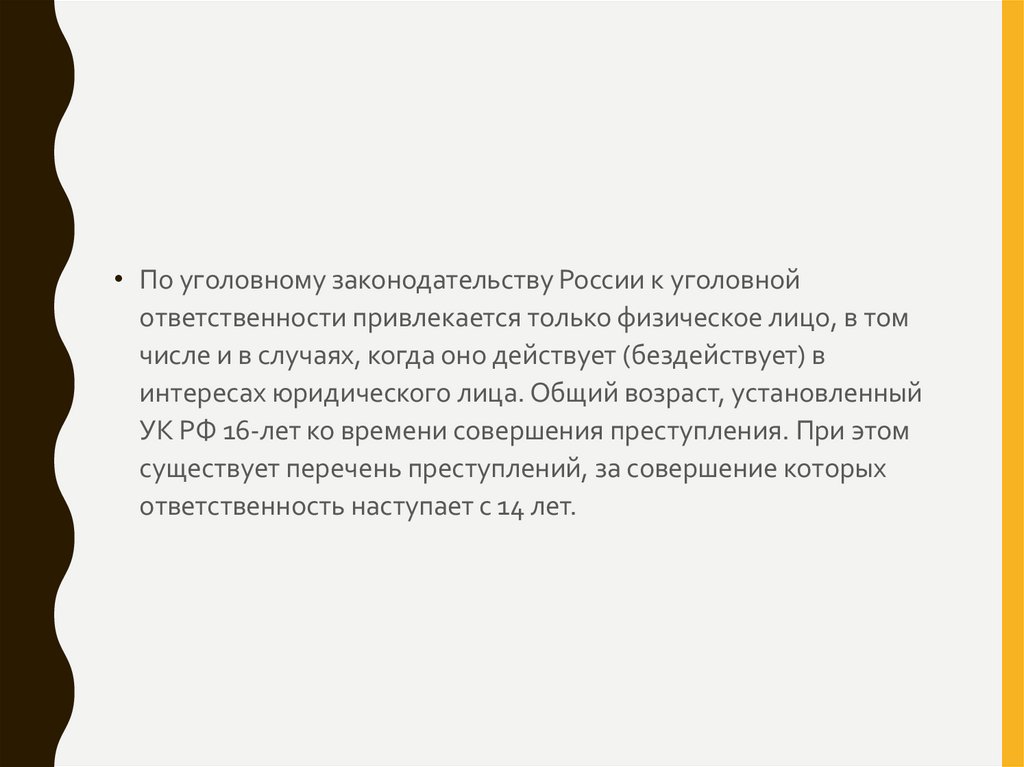 • По уголовному законодательству России к уголовнойответственности привлекается только физическое лицо, в том