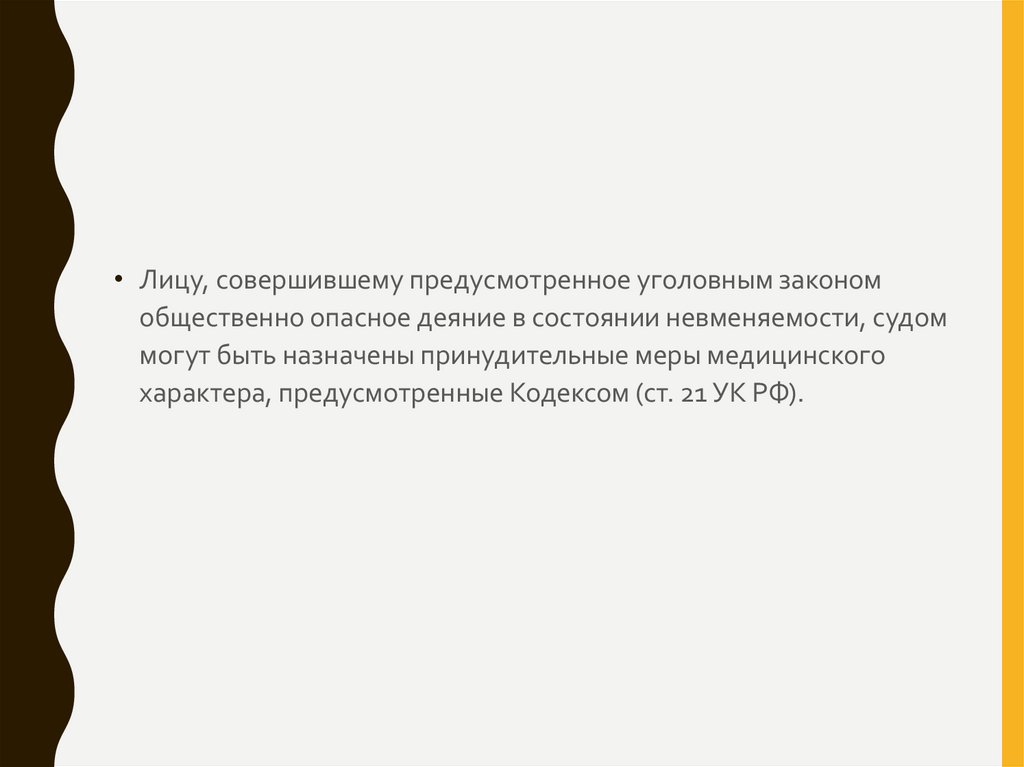 • Лицу, совершившему предусмотренное уголовным закономобщественно опасное деяние в состоянии невменяемости, судом