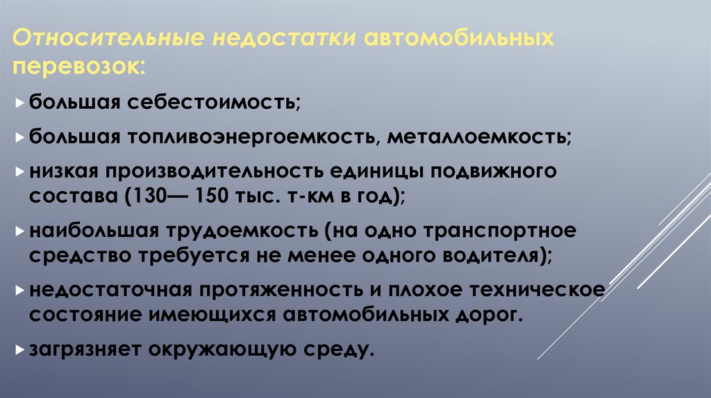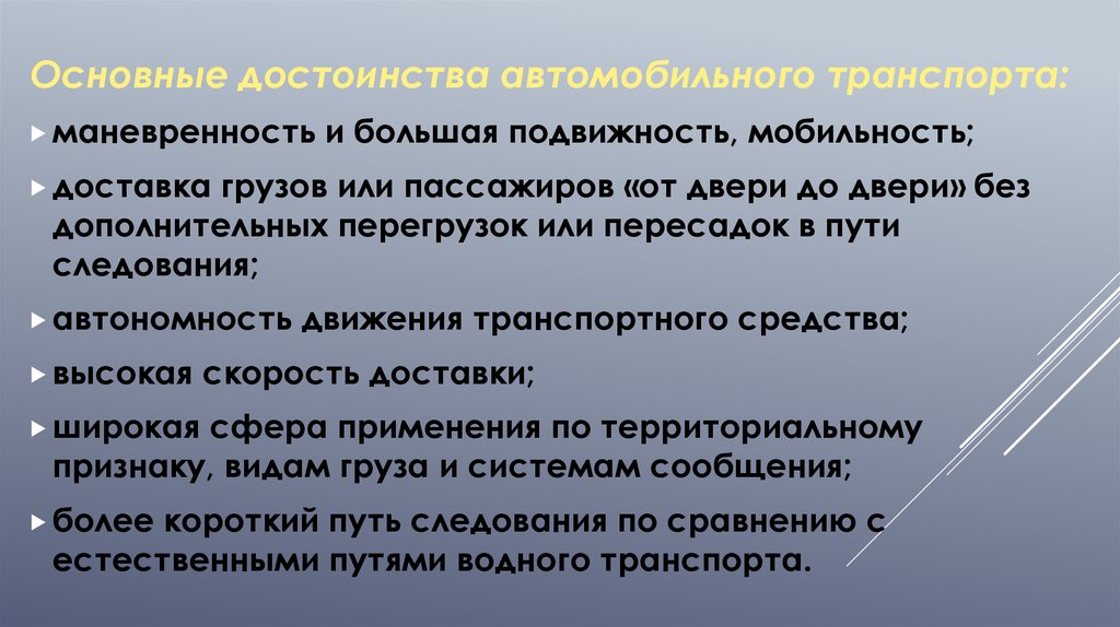 Основные достоинства автомобильного транспорта:маневренность и большая подвижность, мобильность;