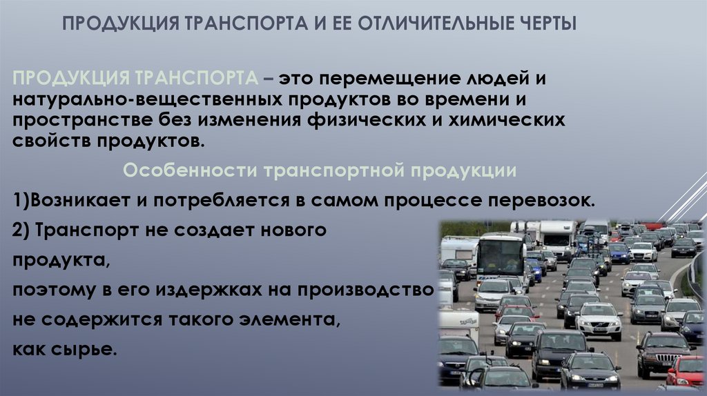 ПРОДУКЦИЯ ТРАНСПОРТА И ЕЕ ОТЛИЧИТЕЛЬНЫЕ ЧЕРТЫПРОДУКЦИЯ ТРАНСПОРТА – это перемещение людей и