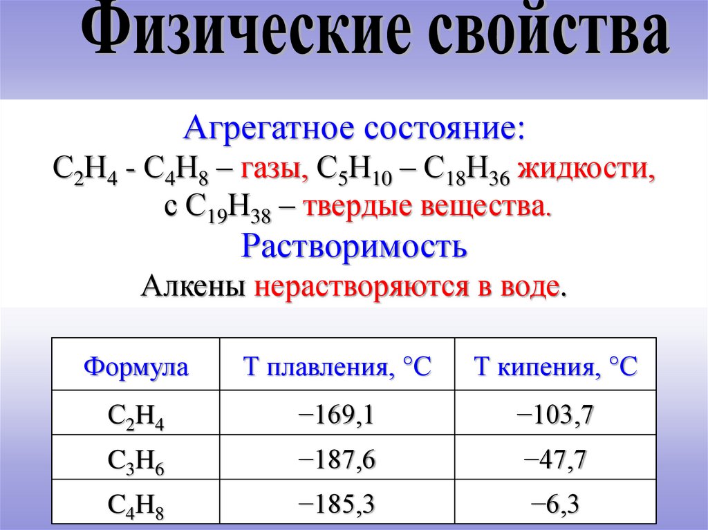 Агрегатное состояние:С2Н4 - С4Н8 – газы, С5Н10 – С18Н36 жидкости,