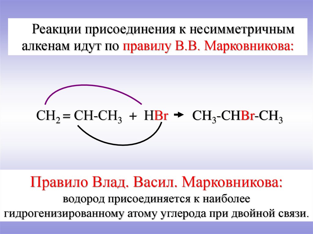 Реакции присоединения к несимметричнымалкенам идут по правилу В.В. Марковникова: