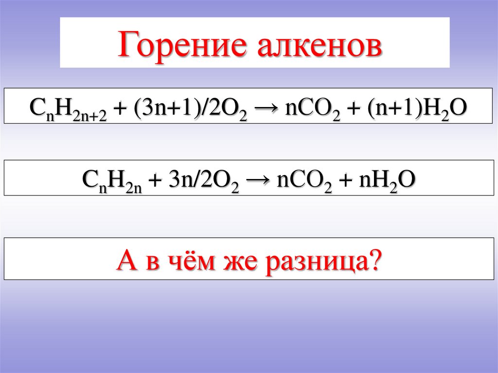 Горение алкеновCnH2n+2 + (3n+1)/2O2 → nCO2 + (n+1)H2O