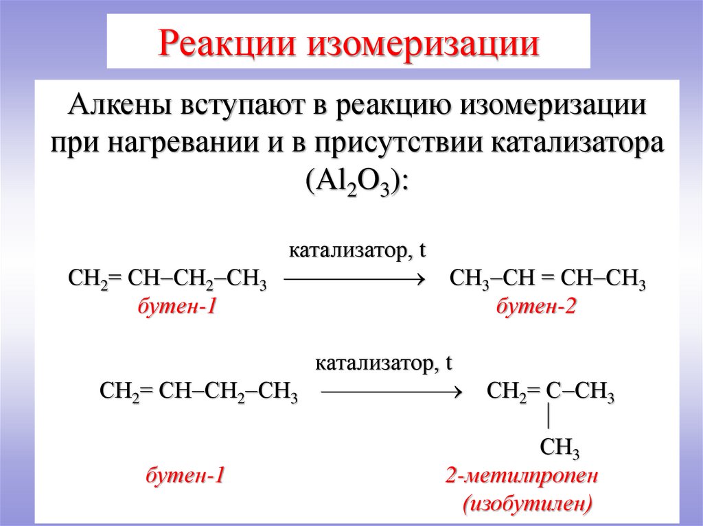 Реакции изомеризацииАлкены вступают в реакцию изомеризации