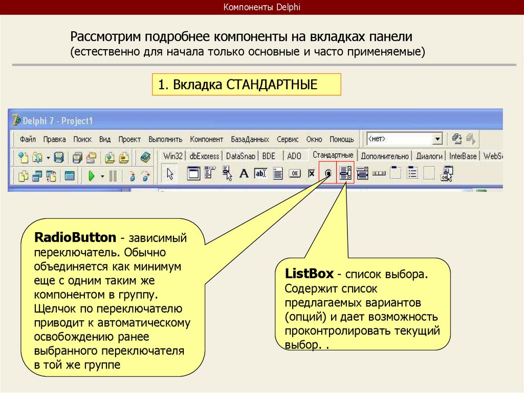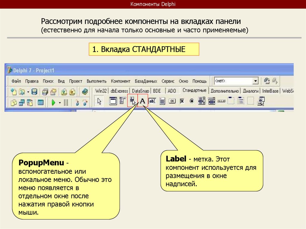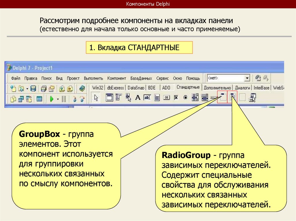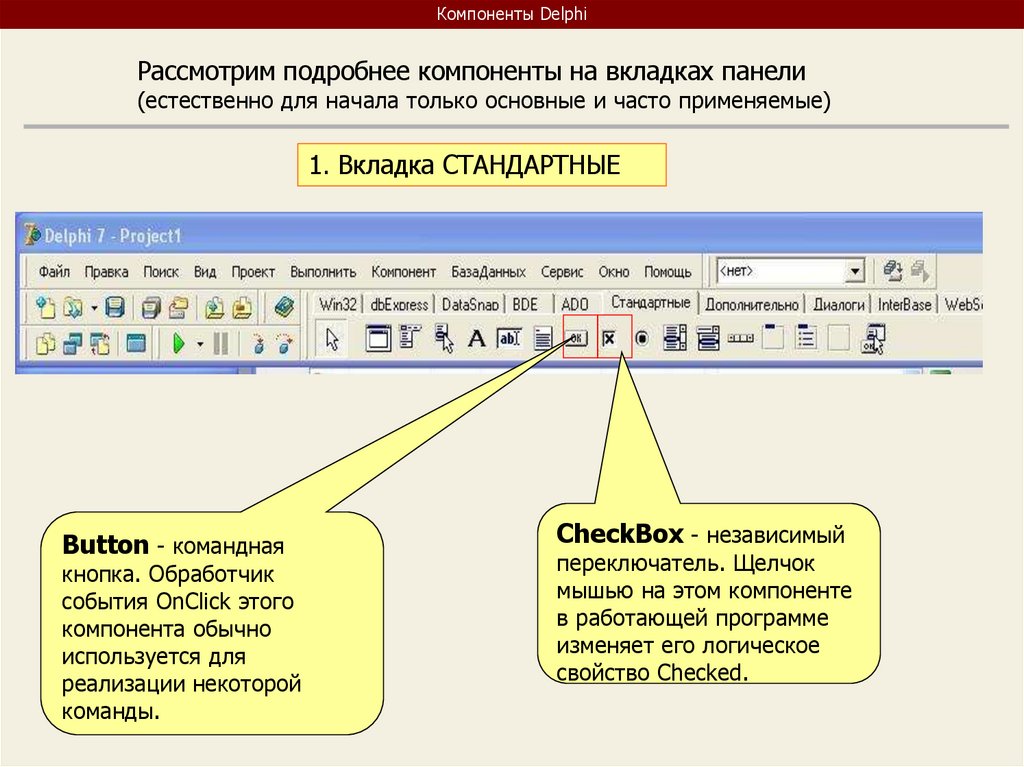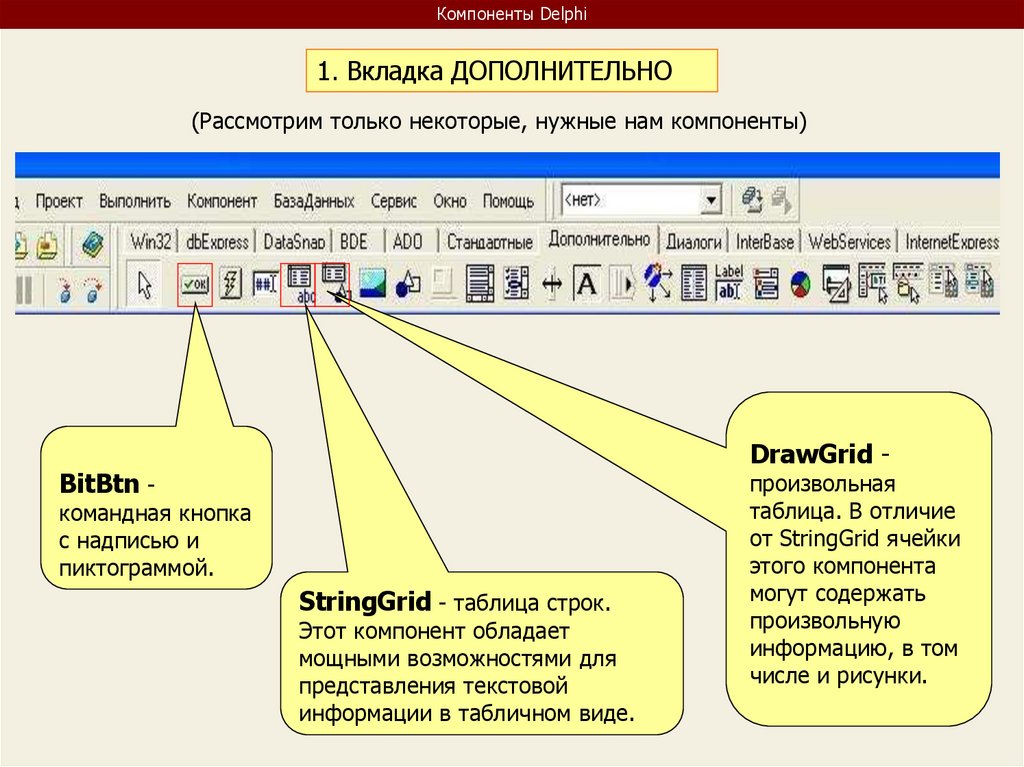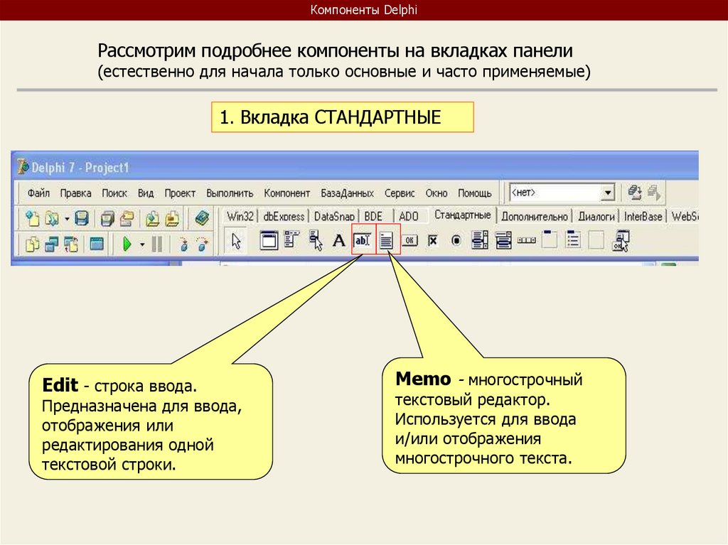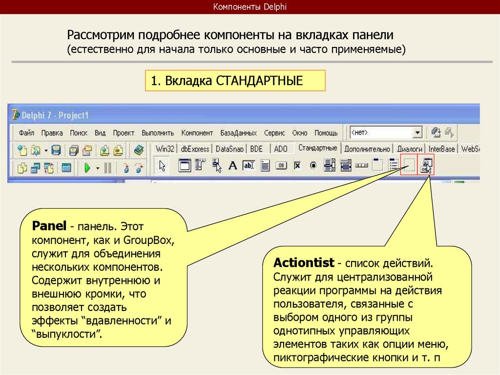 Компоненты DelphiРассмотрим подробнее компоненты на вкладках панели