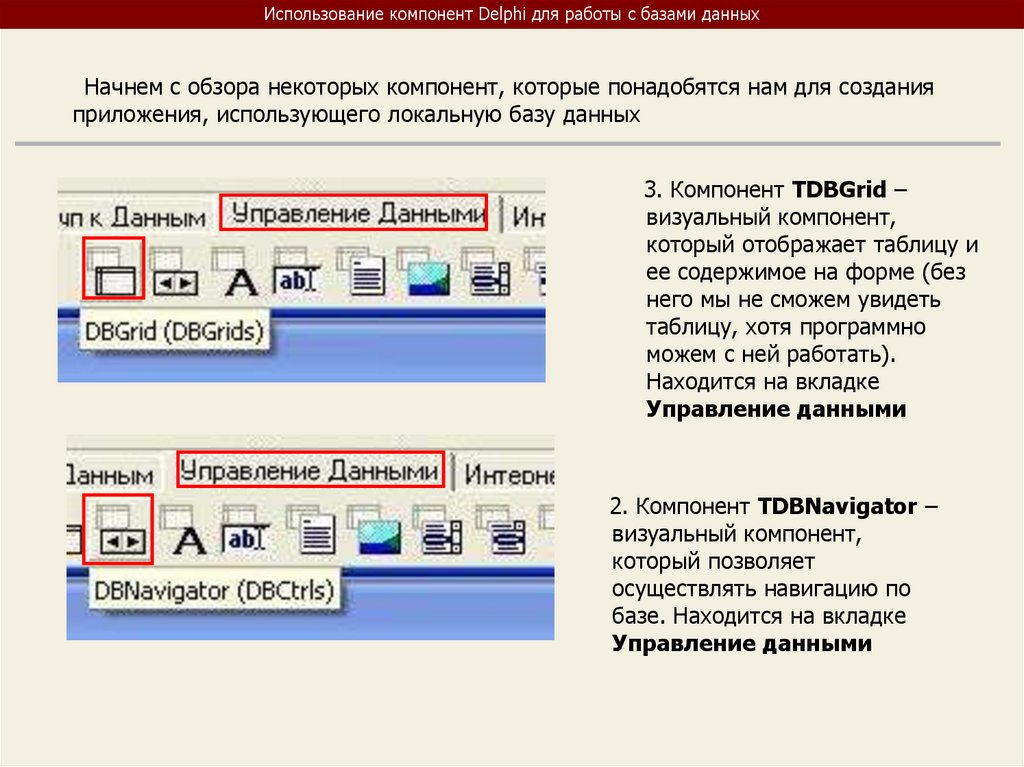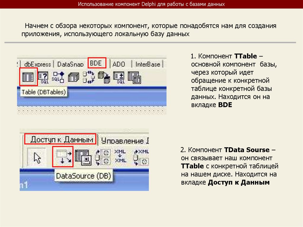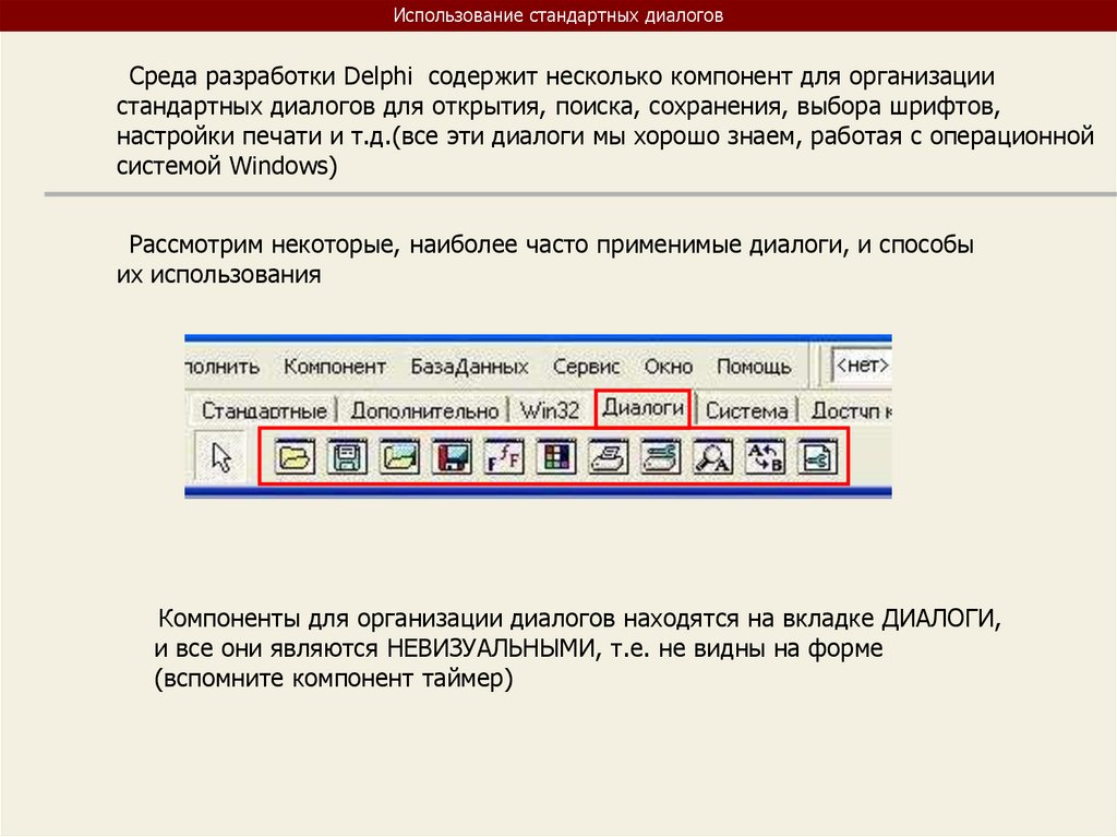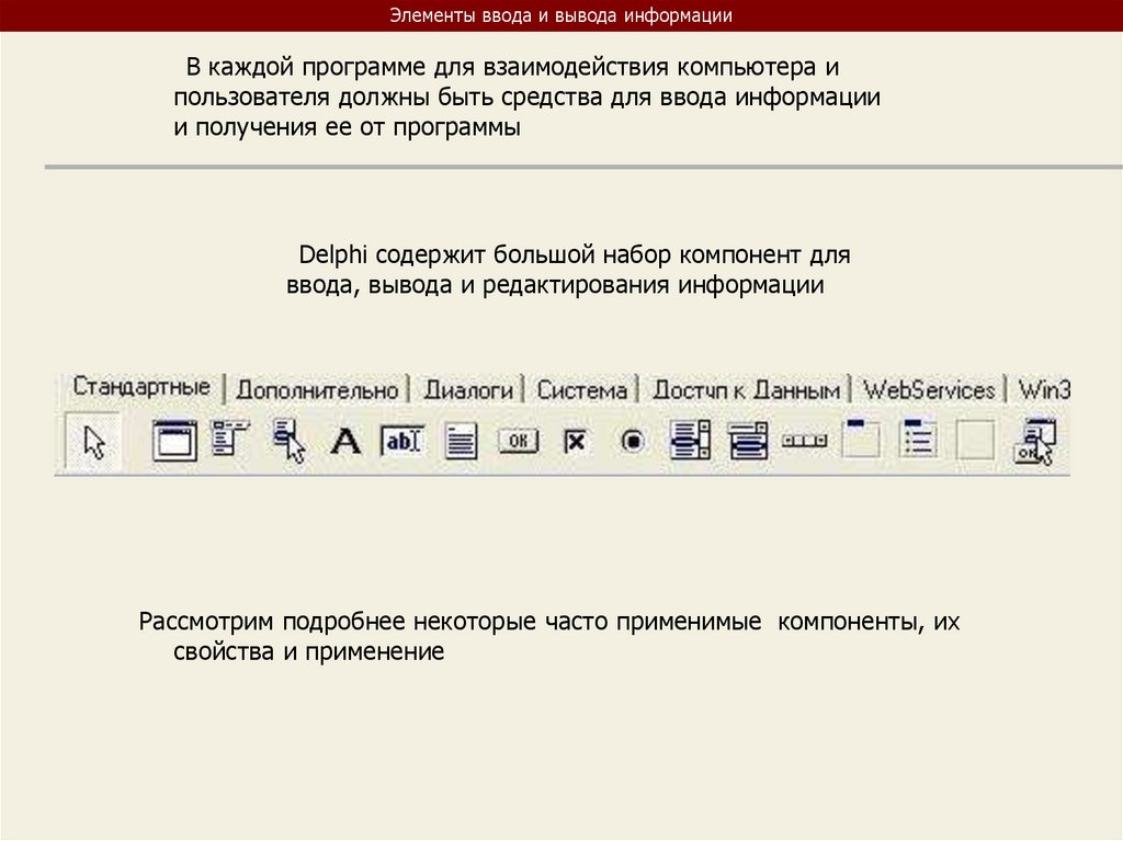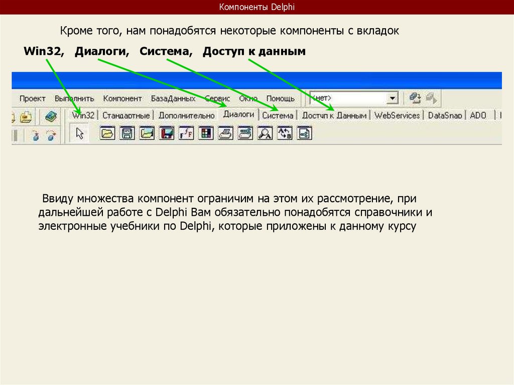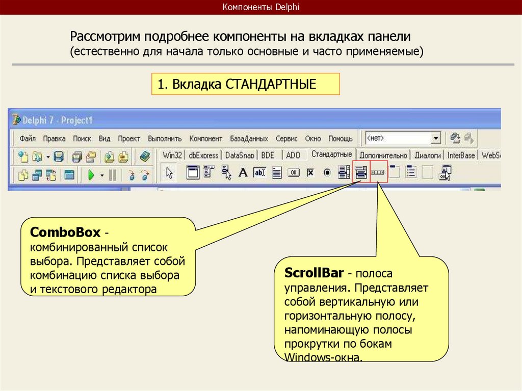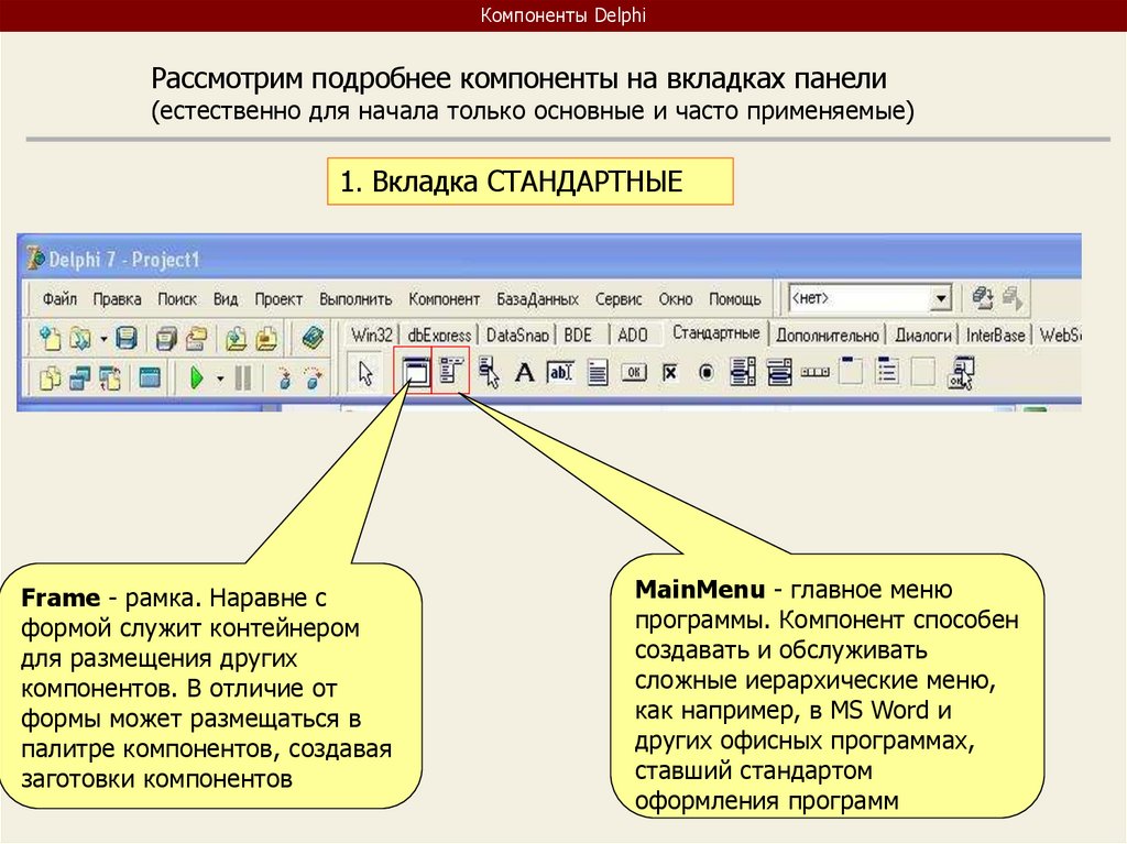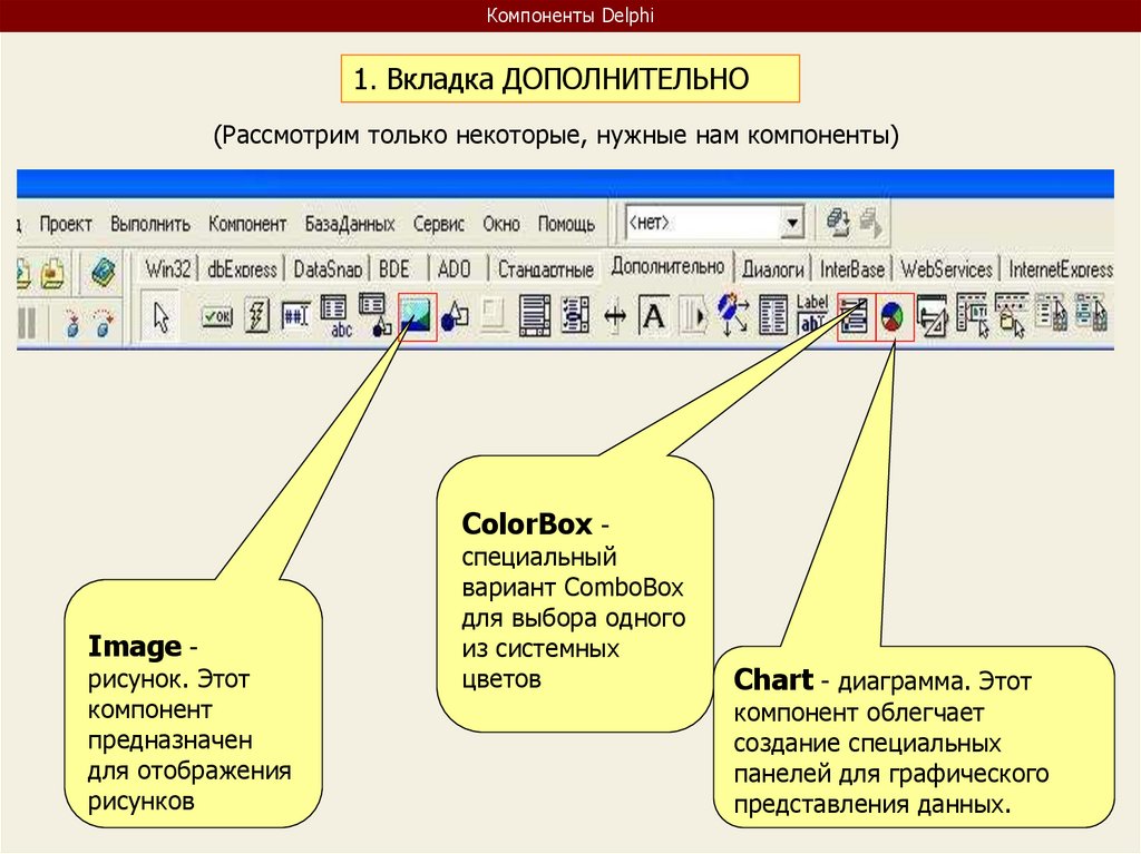 Компоненты DelphiРассмотрим подробнее компоненты на вкладках панели