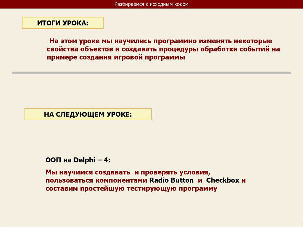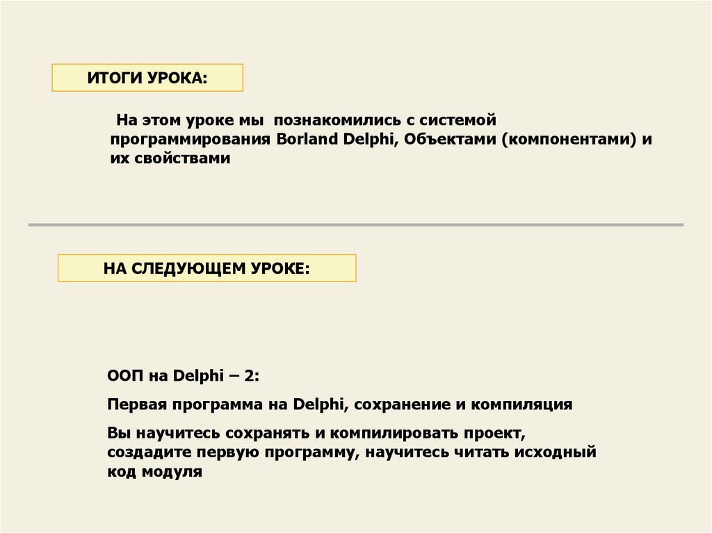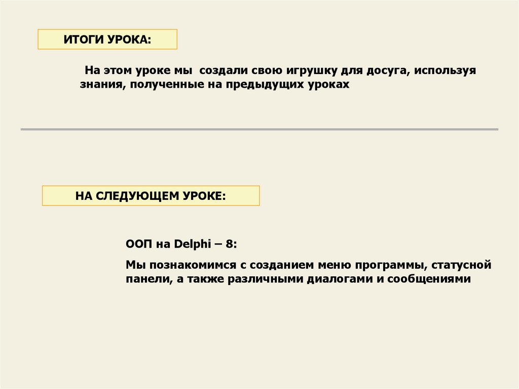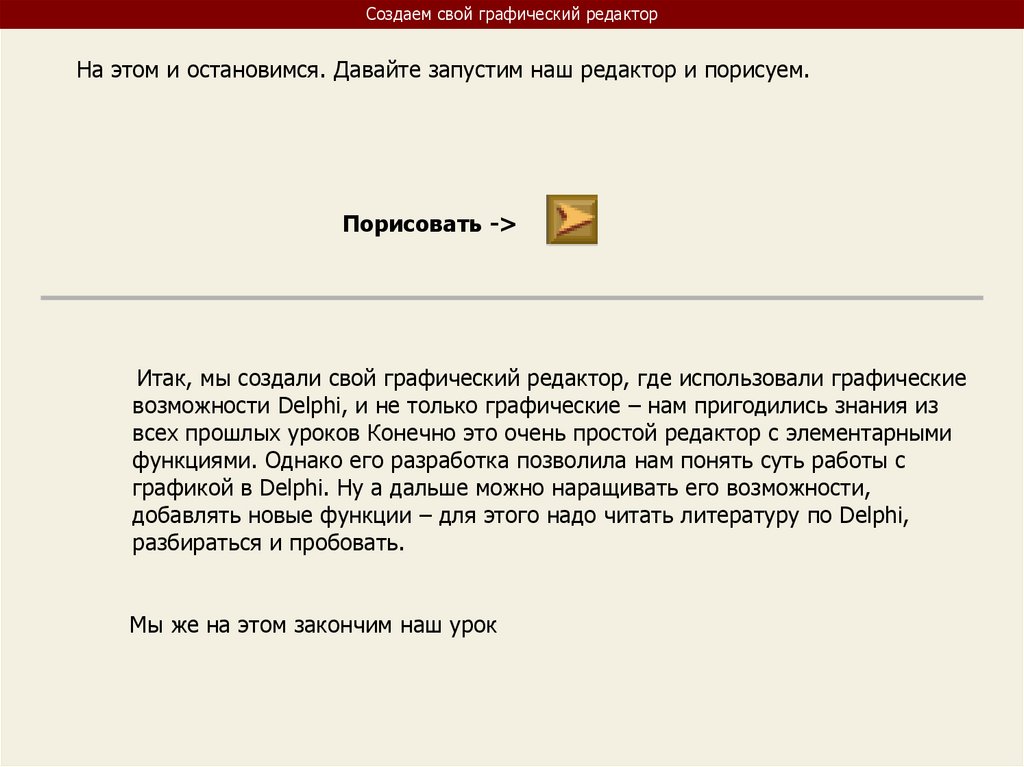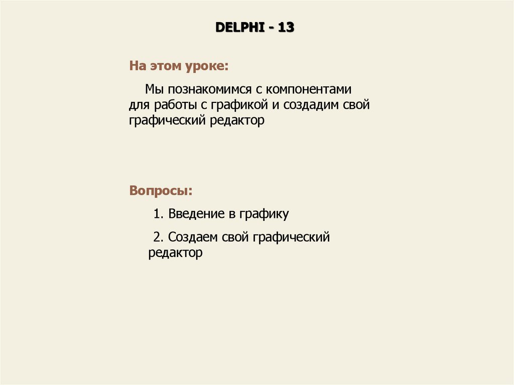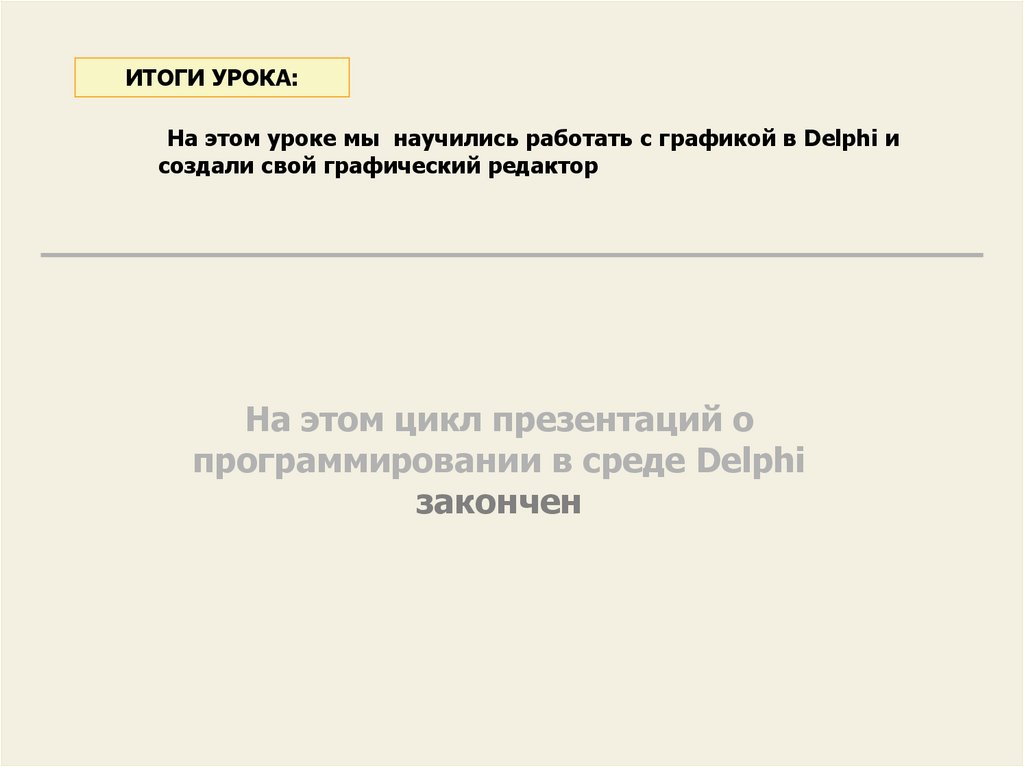 ИТОГИ УРОКА:На этом уроке мы научились работать с графикой в Delphi и