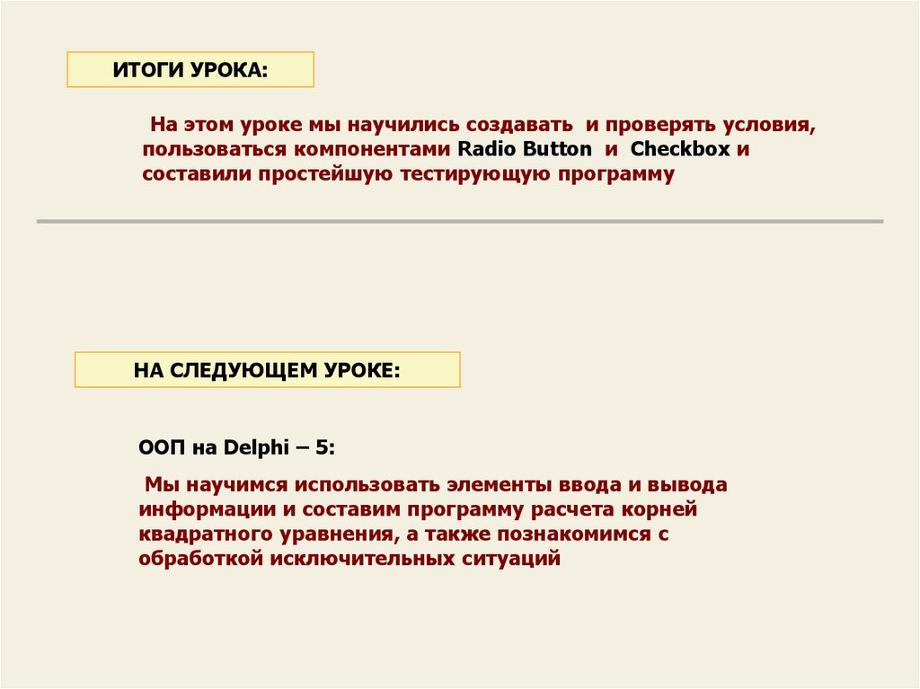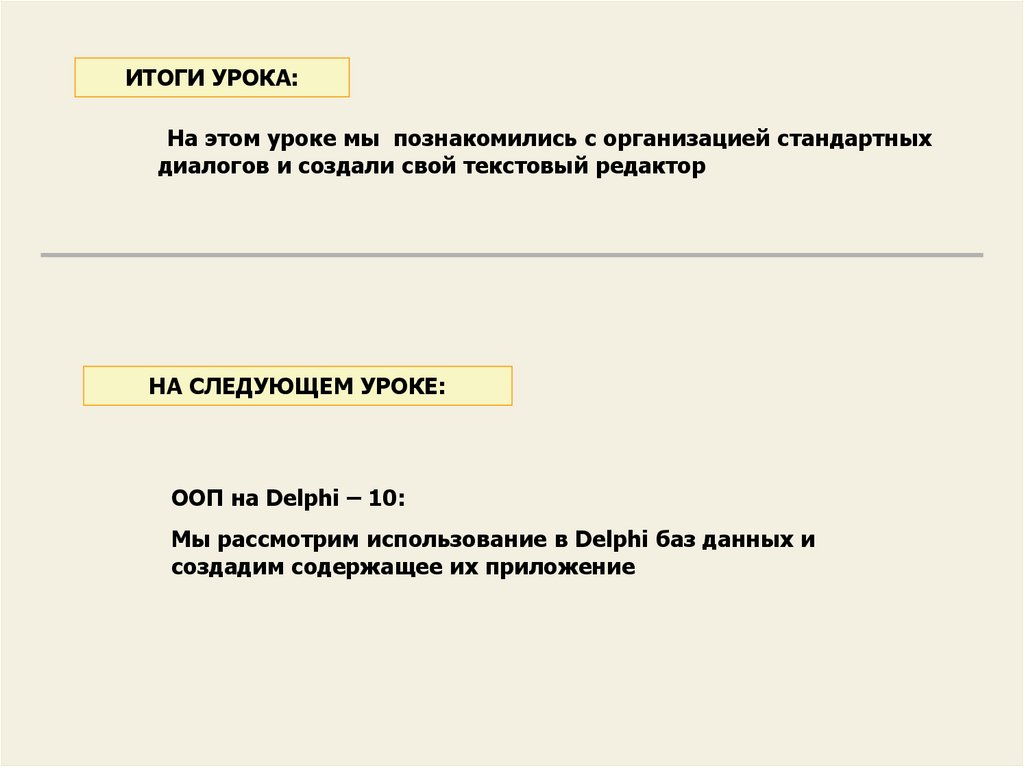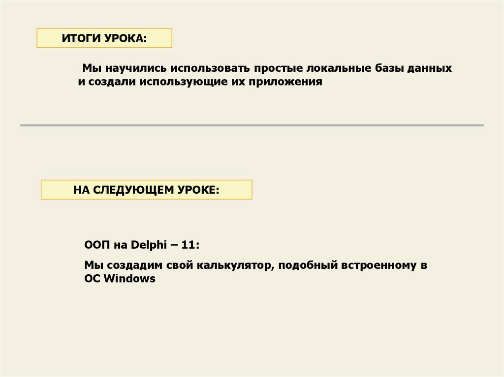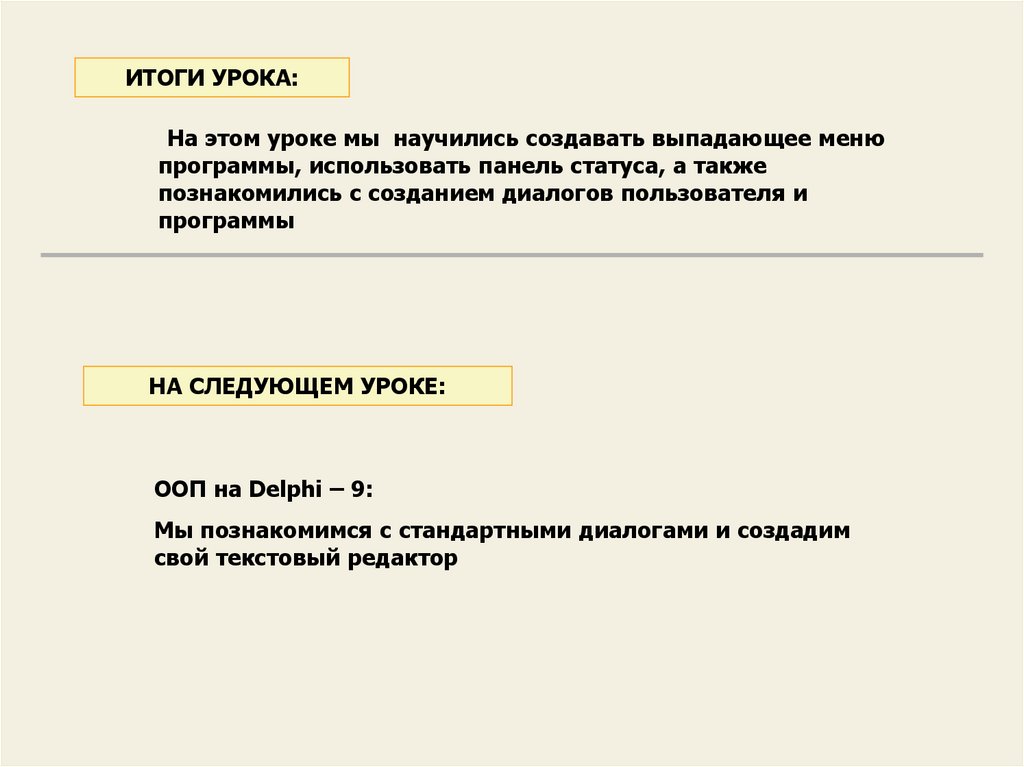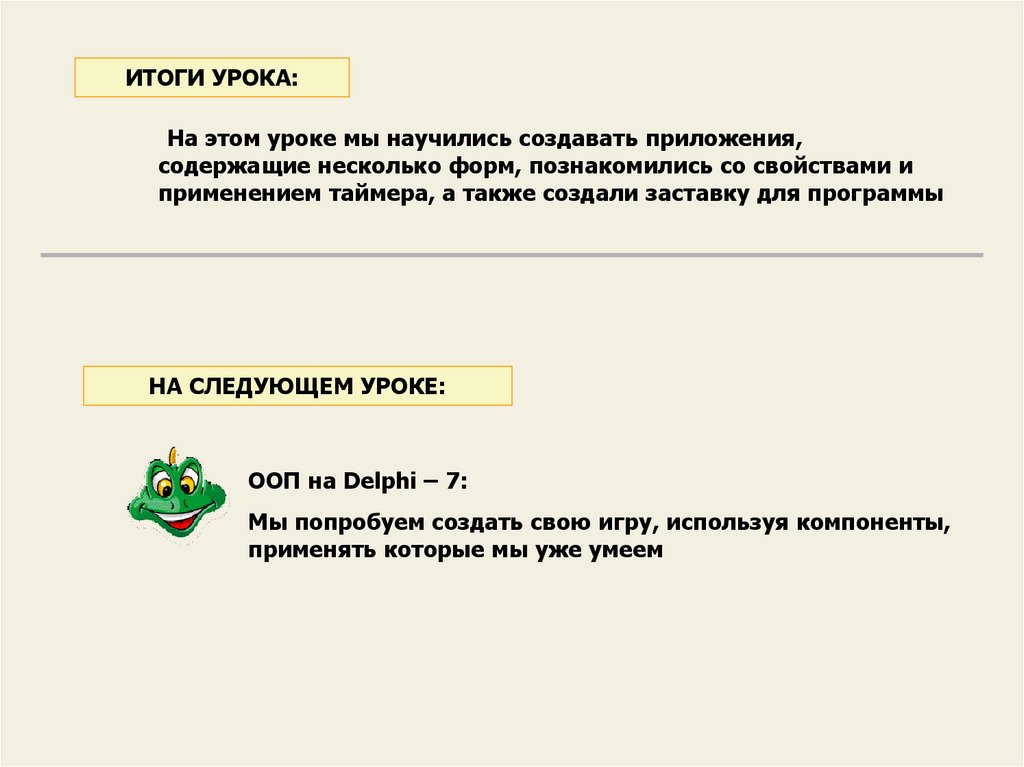 ИТОГИ УРОКА:На этом уроке мы научились работать с графикой в Delphi и