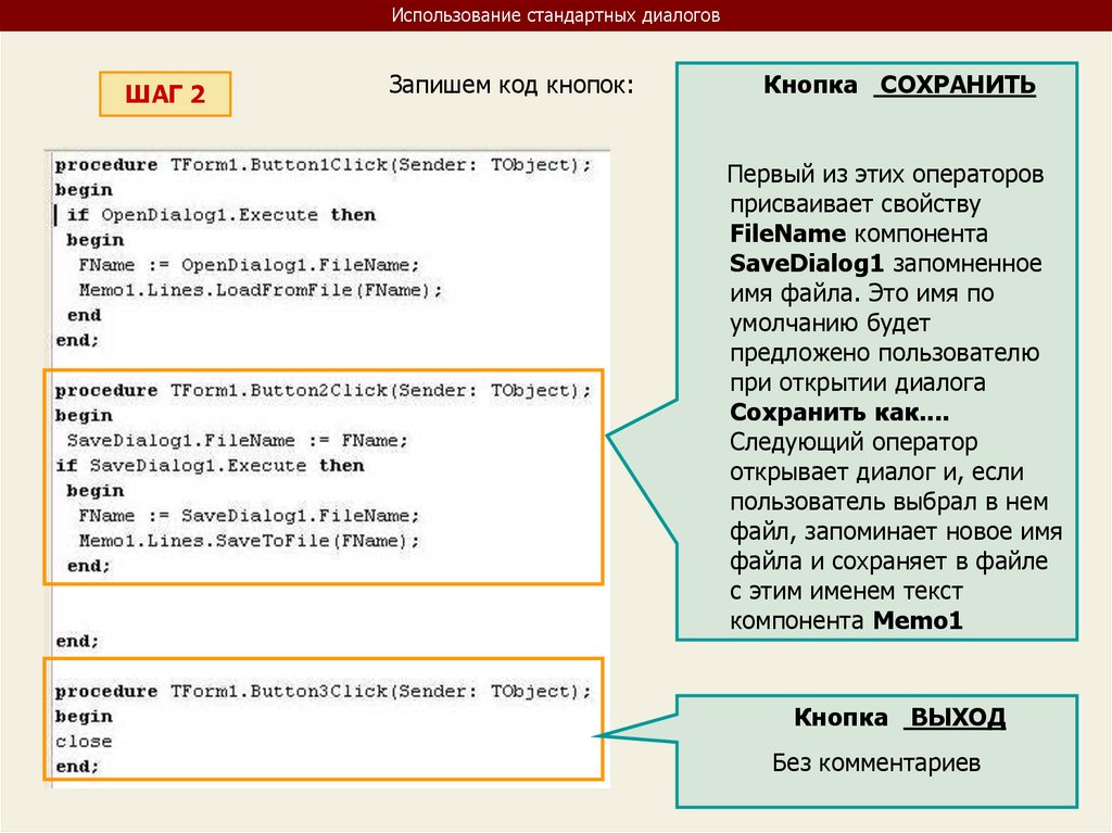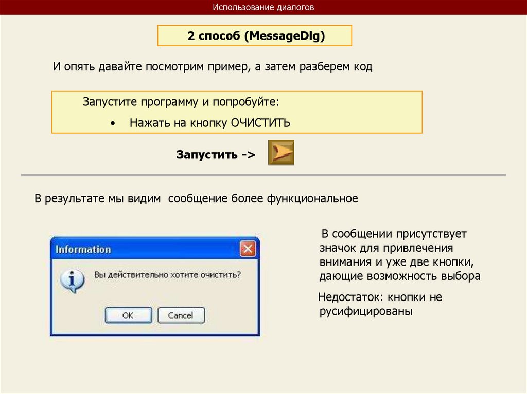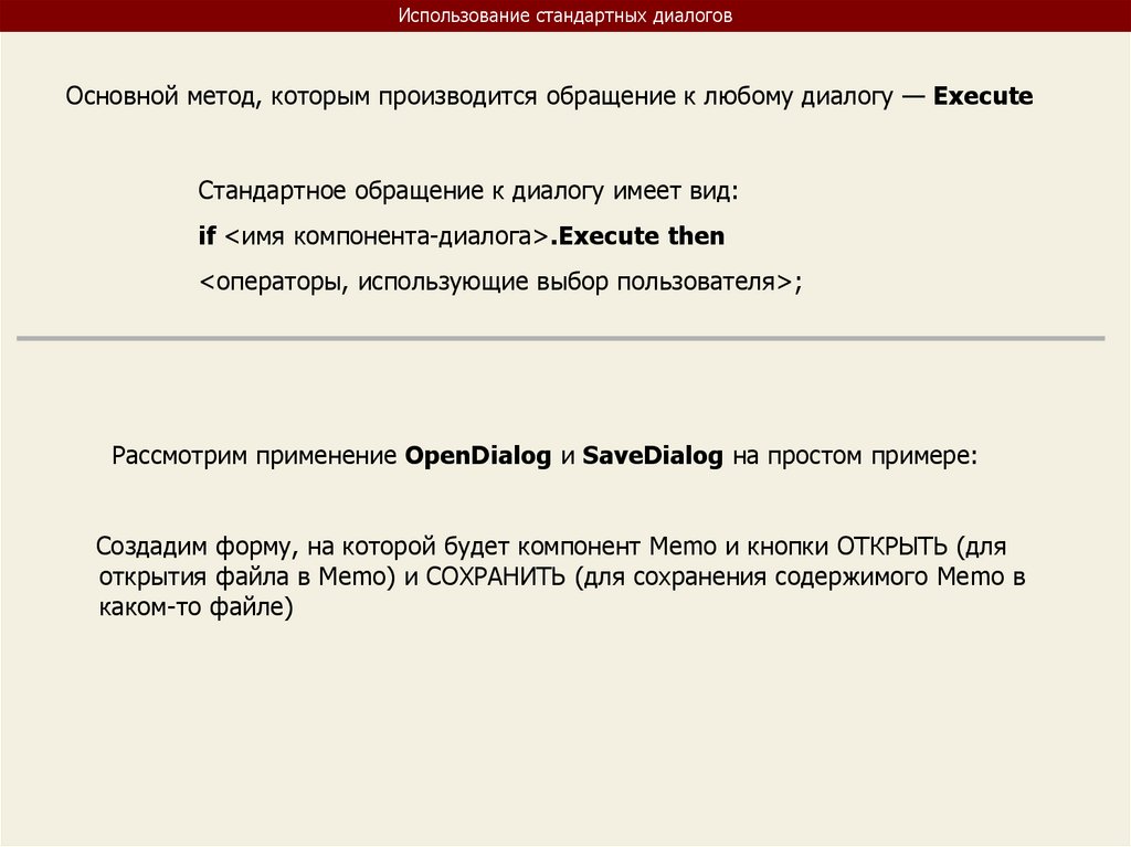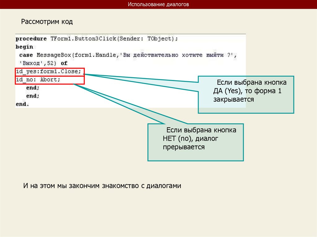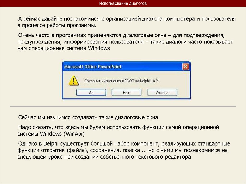Диалоги рассмотрены нами ранее довольно подробно, поэтому комментарии излишни