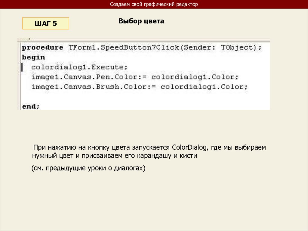 При нажатию на кнопку цвета запускается ColorDialog, где мы выбираем