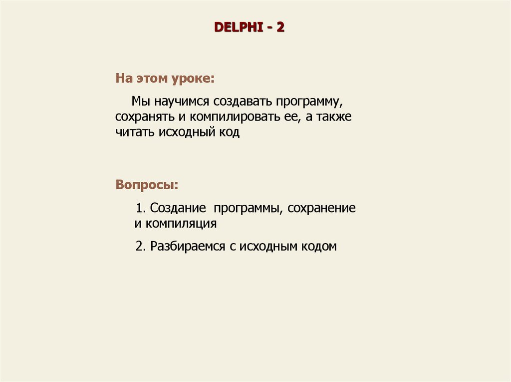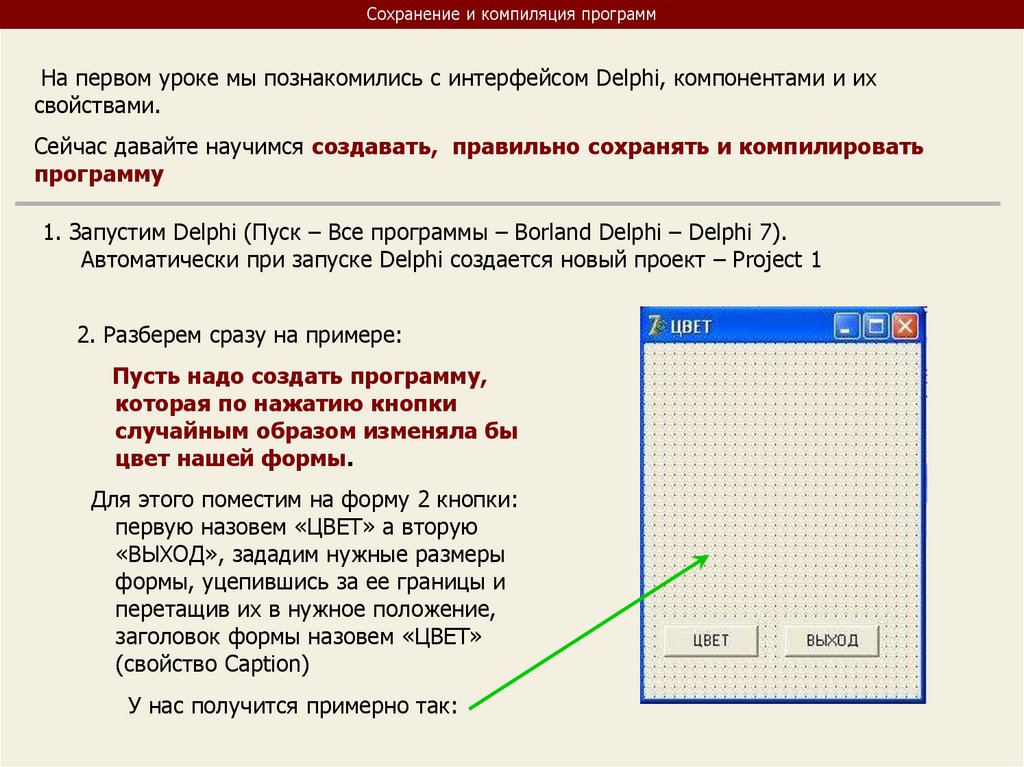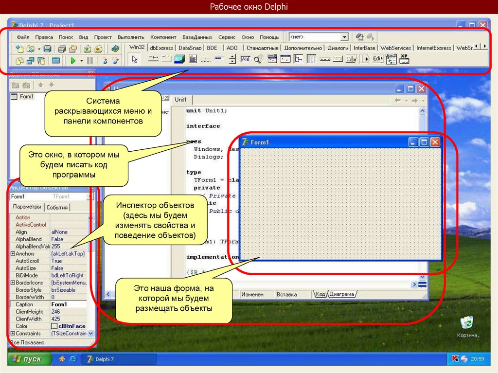 На этом уроке мы познакомимся с рабочим окном Delphi - 7 и, некоторыми его часто
