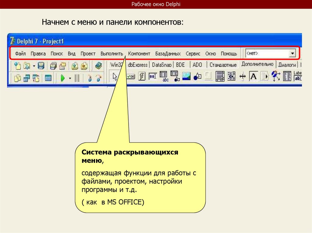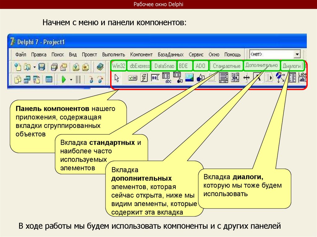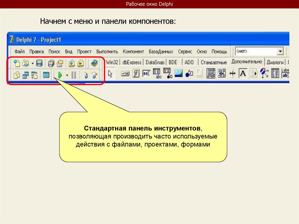 Рабочее окно DelphiНачнем с меню и панели компонентов:
