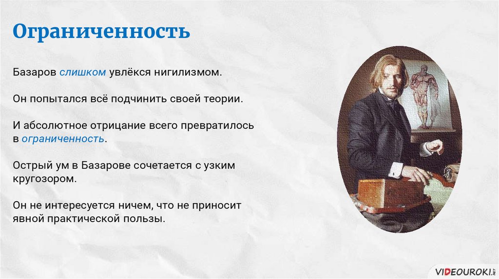 ОграниченностьБазаров слишком увлёкся нигилизмом.