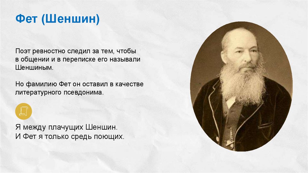 Фет (Шеншин)Поэт ревностно следил за тем, чтобы