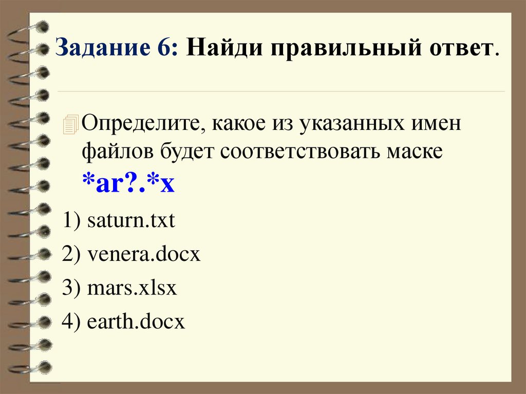 47. Задание 4: Выбери в списке имён файлов те, которые подходят к маске ?ic*.??t. Поясни свой ответ.