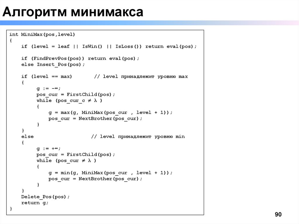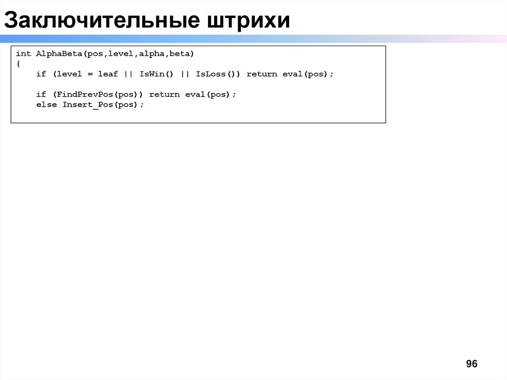 Заключительные штрихиint AlphaBeta(pos,level,alpha,beta)
