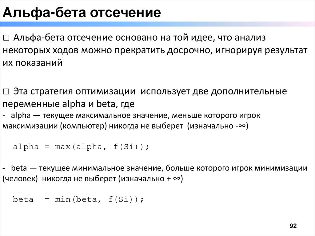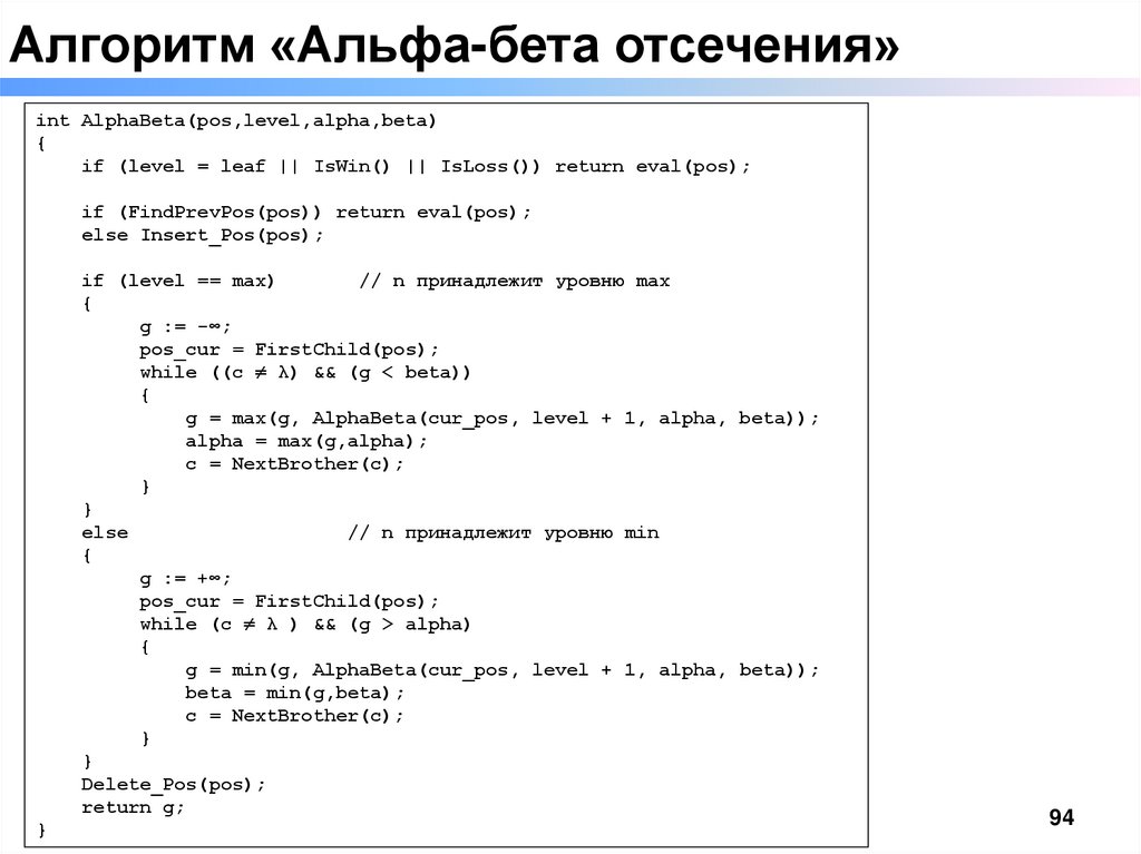 Алгоритм «Альфа-бета отсечения»int AlphaBeta(pos,level,alpha,beta)