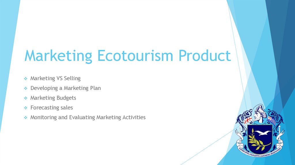 Active marketing is required to sell your ecotourism product.Develop a marketing plan that looks at the product you offer, its pricing, the possible