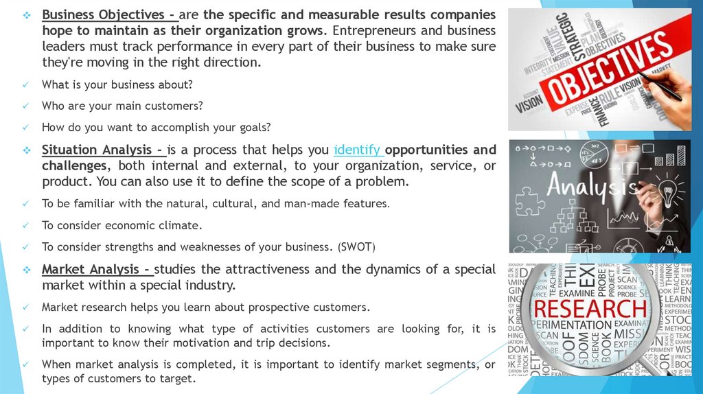 Business Objectives - are the specific and measurable results companieshope to maintain as their organization grows. Entrepreneurs and business