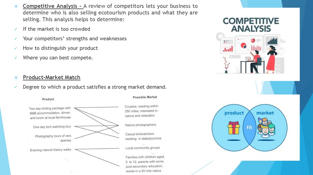 Competitive Analysis - A review of competitors lets your business todetermine who is also selling ecotourism products and what they are