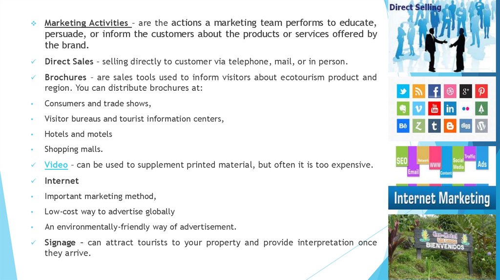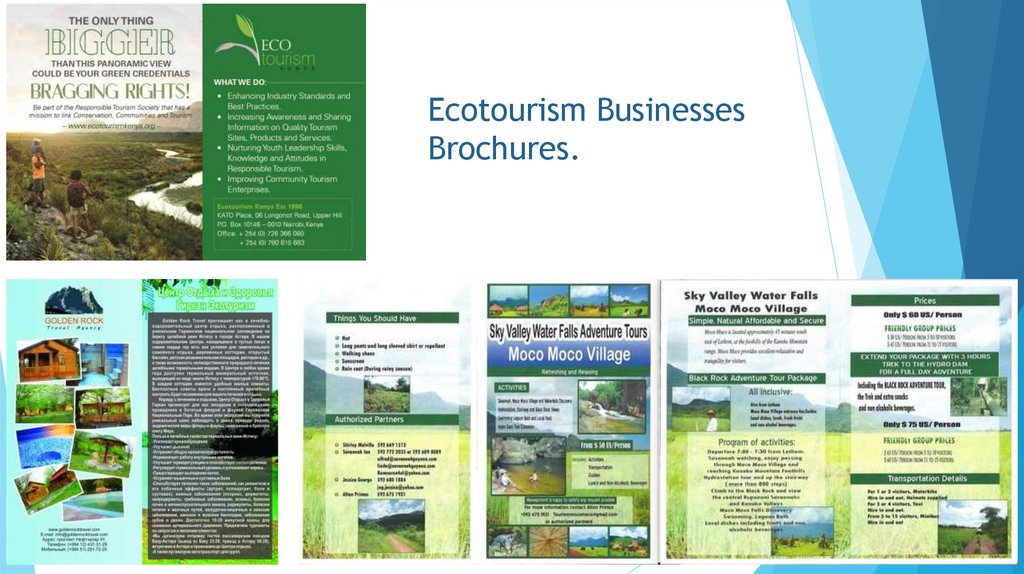 Brochures – are sales tools used to inform visitors about ecotourism product and
