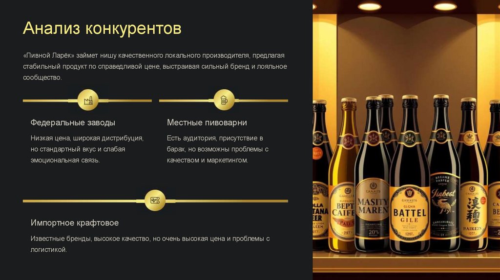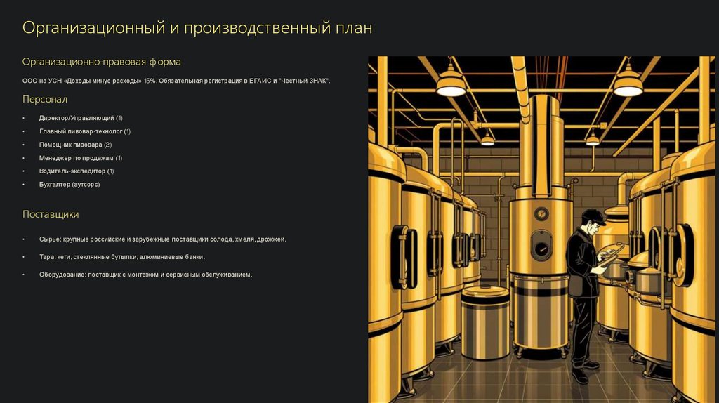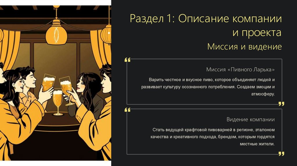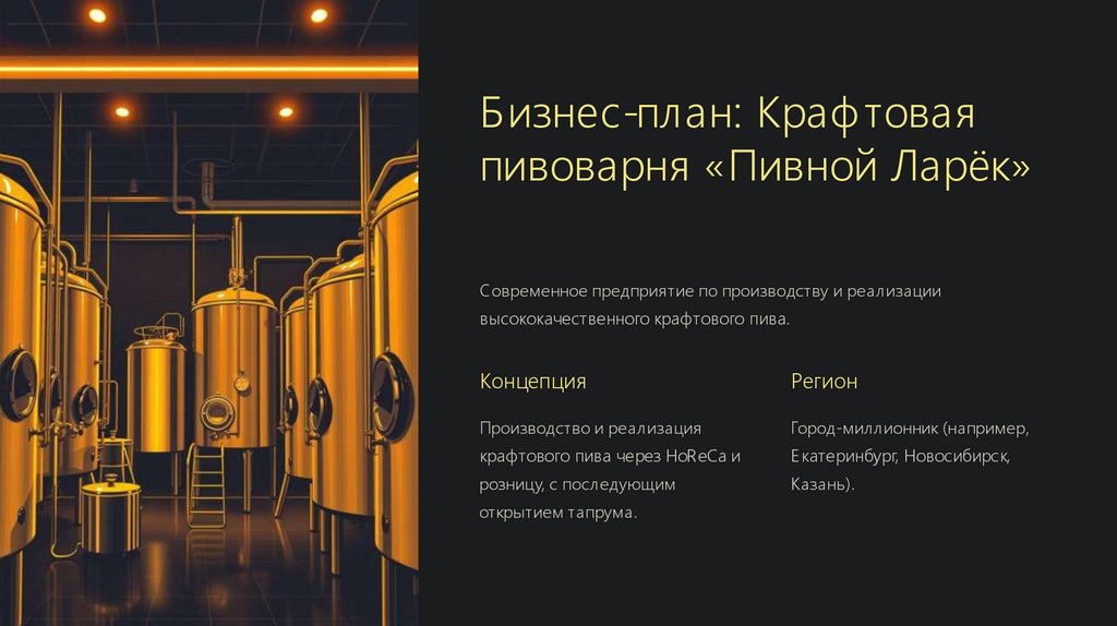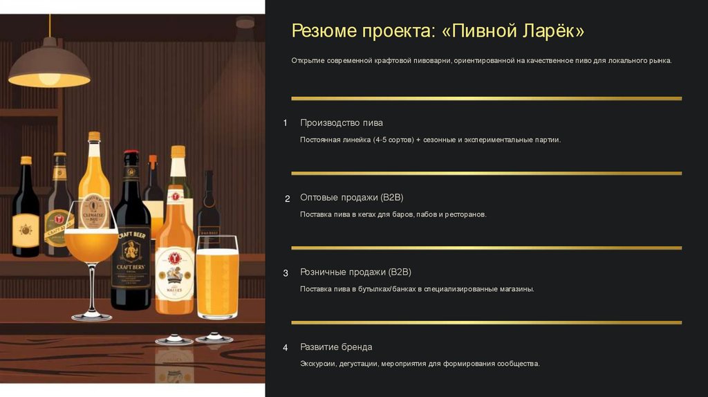 Резюме проекта: «Пивной Ларёк»Открытие современной крафтовой пивоварни, ориентированной на качественное пиво для локального рынка.