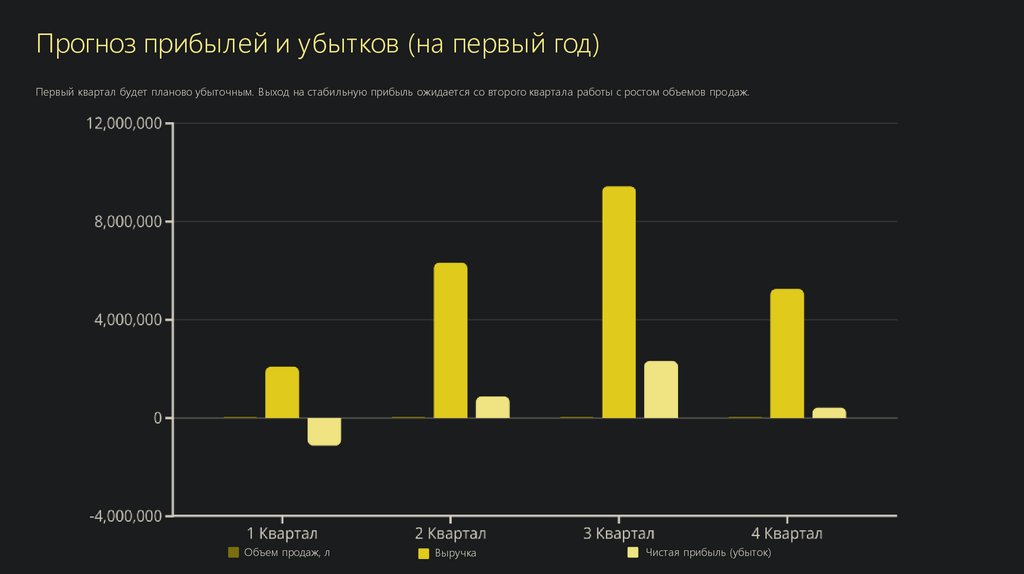 Прогноз прибылей и убытков (на первый год)Первый квартал будет планово убыточным. Выход на стабильную прибыль ожидается со второго квартала работы с ростом объемов продаж.