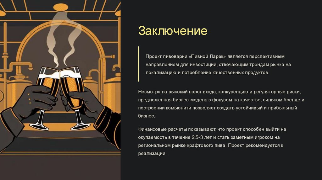 ЗаключениеПроект пивоварни «Пивной Ларёк» является перспективным