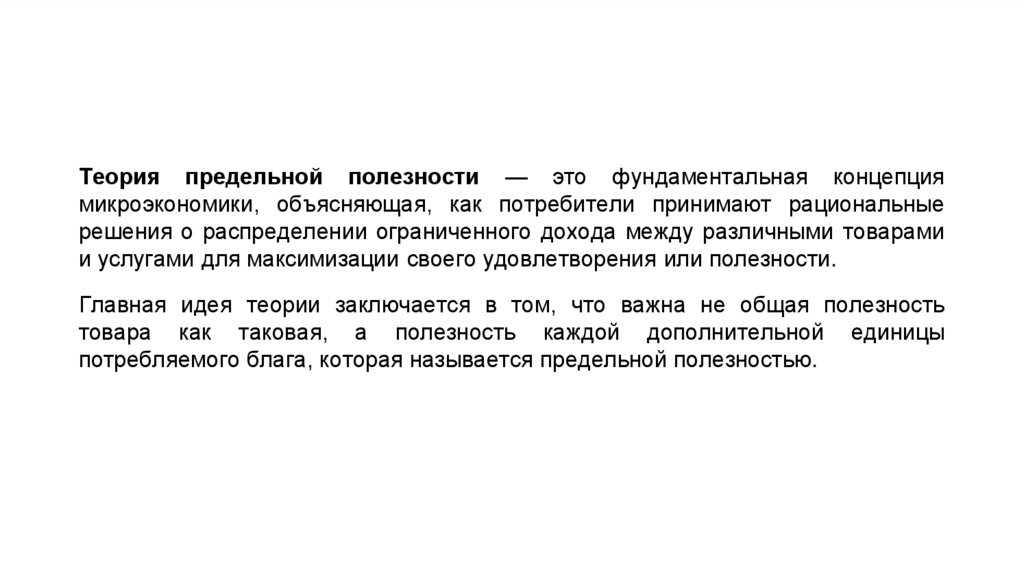 Теория предельной полезности — это фундаментальная концепциямикроэкономики, объясняющая, как потребители принимают рациональные