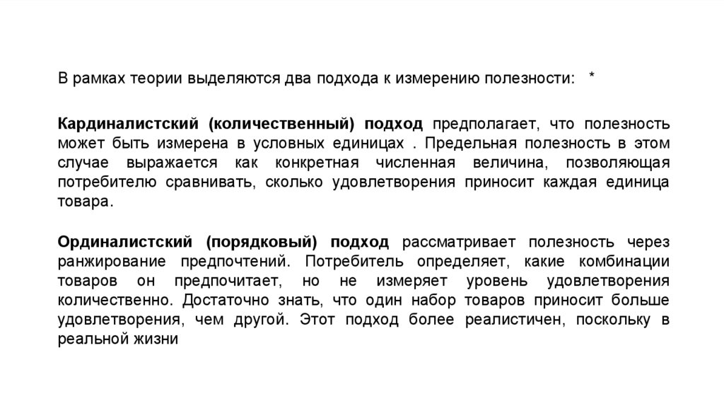 В рамках теории выделяются два подхода к измерению полезности: *Кардиналистский (количественный) подход предполагает, что полезность