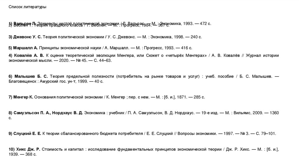 6) Малышев Б. С. Теория предельной полезности (потребитель на рынке товаров и услуг) : учеб. пособие / Б. С. Малышев. —